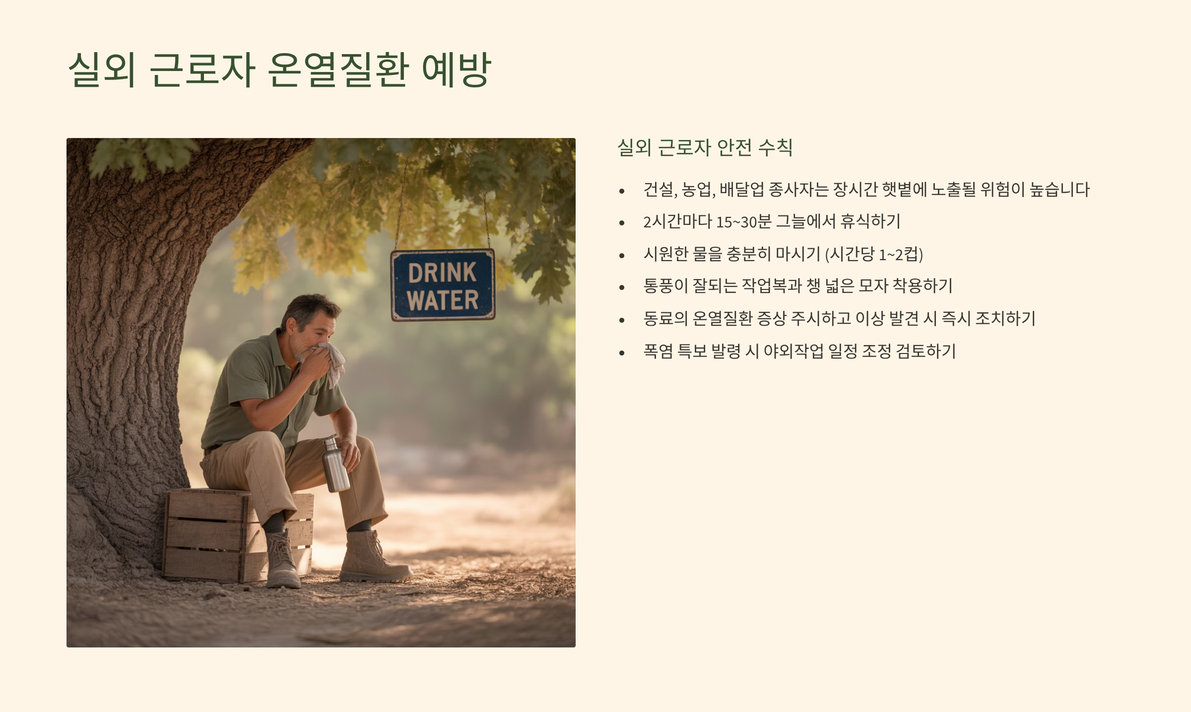 - 실외 근로자: 건설, 농업, 배달업 종사자는 장시간 햇볕에 노출될 위험이 있습니다.