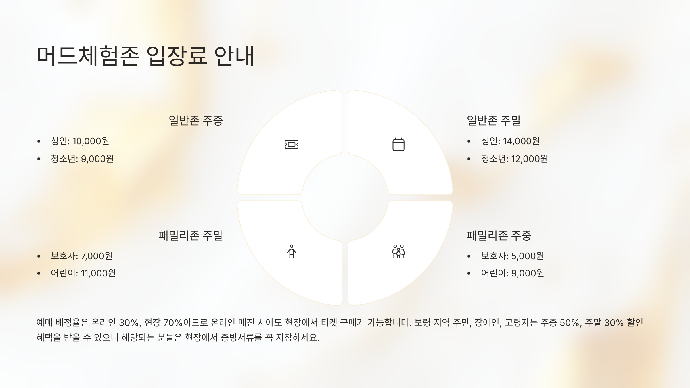 보령 지역 주민이나 장애인, 고령자는 주중 50%, 주말 30% 할인 혜택이 있으며, 현장 증빙서류 지참 필수입니다.