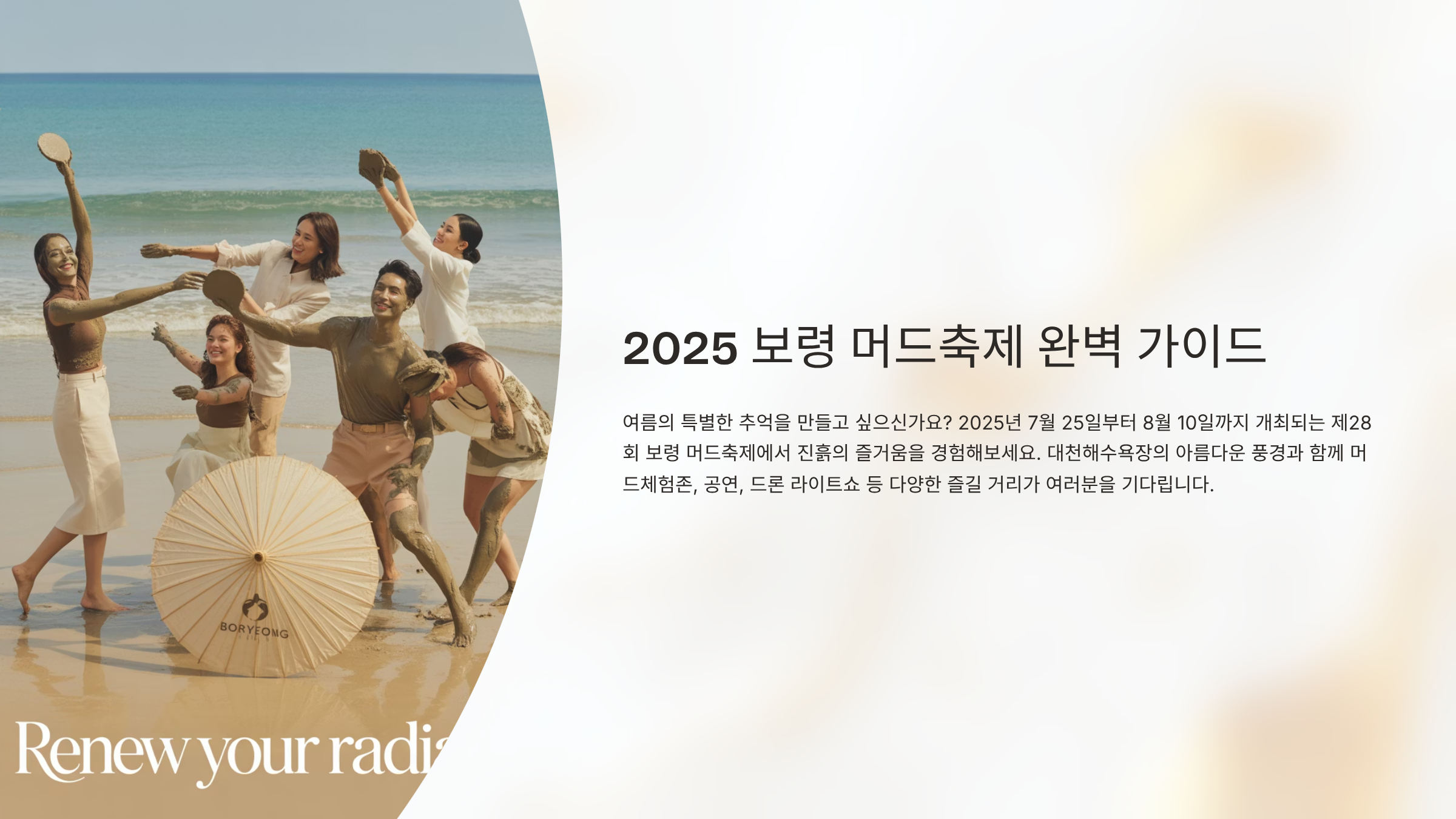대천해수욕장을 물들인 진흙과 음악, 그리고 밤하늘에 펼쳐지는 드론 라이트쇼까지 더해진 2025 보령 머드축제는 단순한 축제를 넘어 감각적 경험을 제공합니다.
