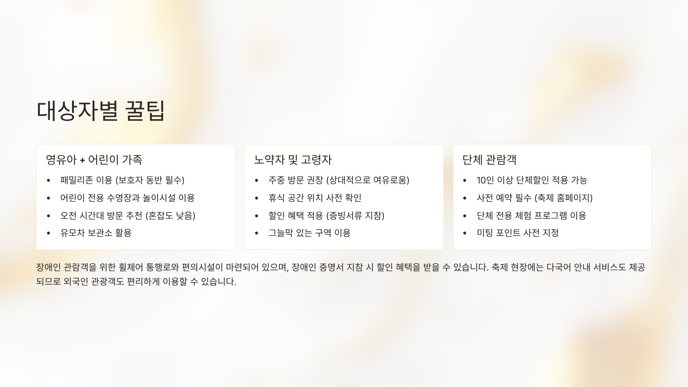 - 장애인 관람객: 장애인 할인 및 휠체어 통행로 사전 문의