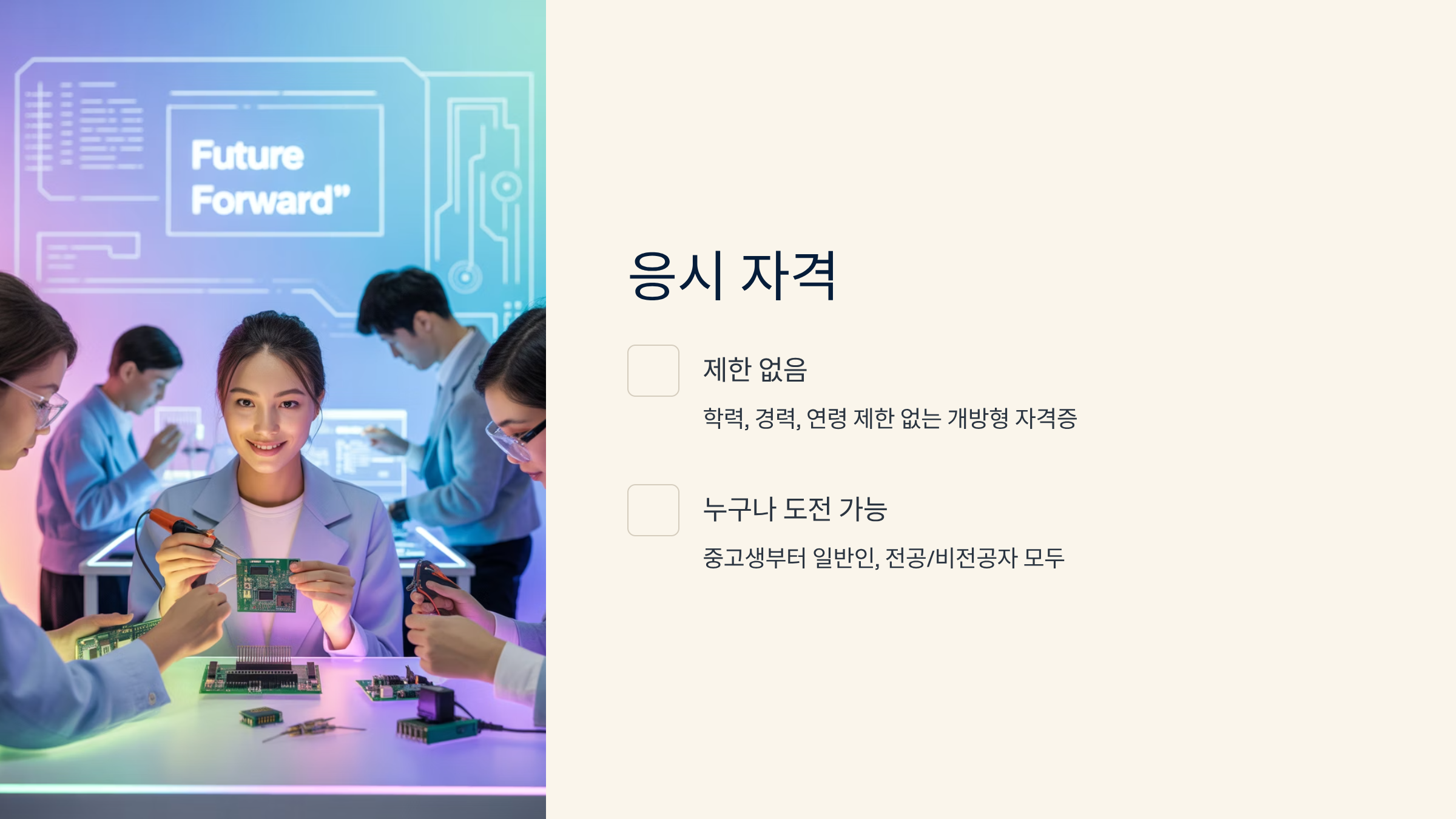 전기기능사는 학력, 경력, 연령 제한이 없는 개방형 자격증이에요. 중고등학생부터 일반인, 재직자, 전기 분야 전공자 및 비전공자 모두 응시할 수 있습니다.