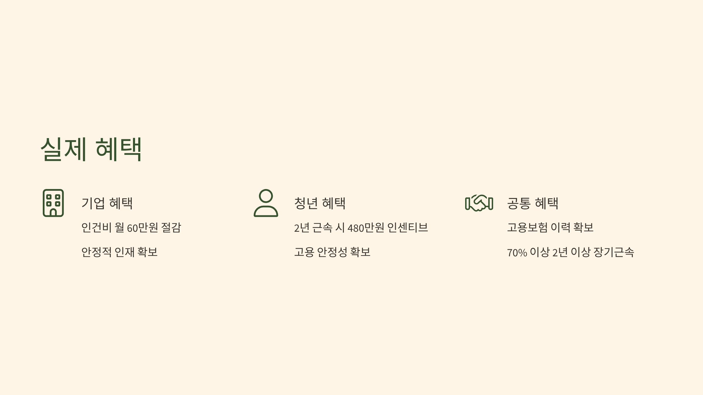 - 청년 입장: 2년 근속 시 최대 480만 원 인센티브 수령 + 고용 안정성