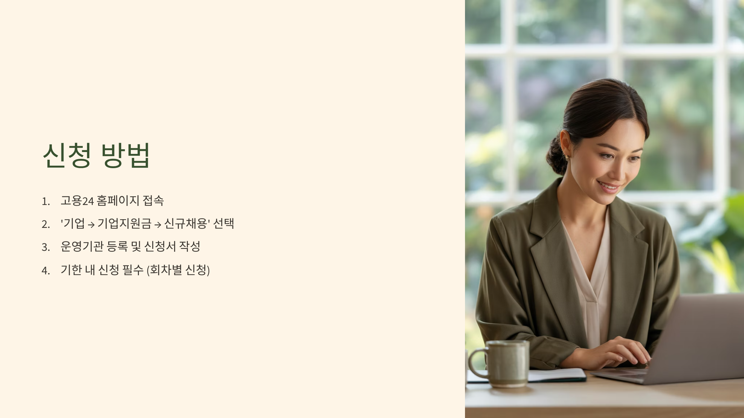 - 지원 조건: 6개월 이상 고용 시 월 60만 원, 최대 12개월간 총 720만 원 기업 지원