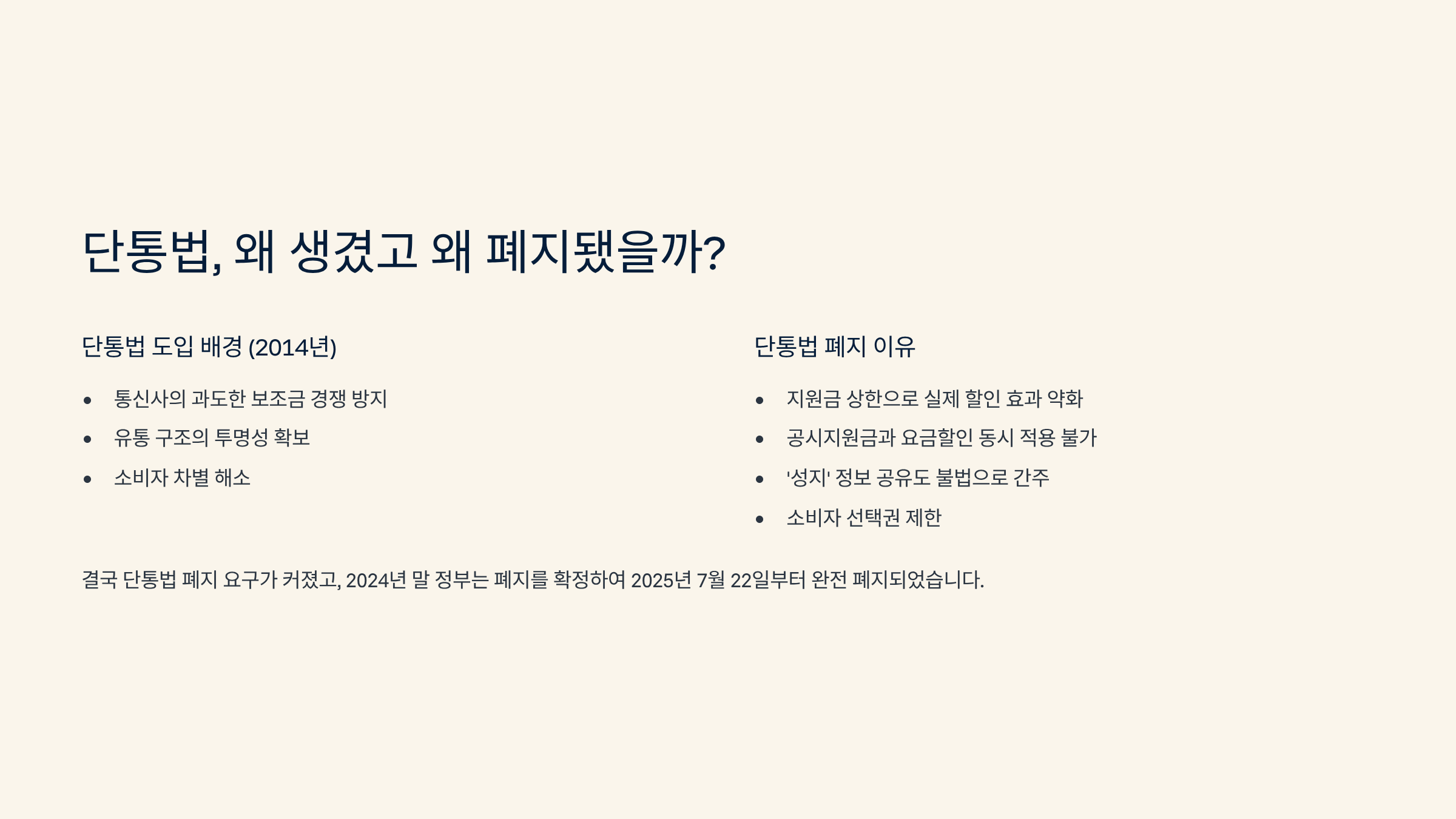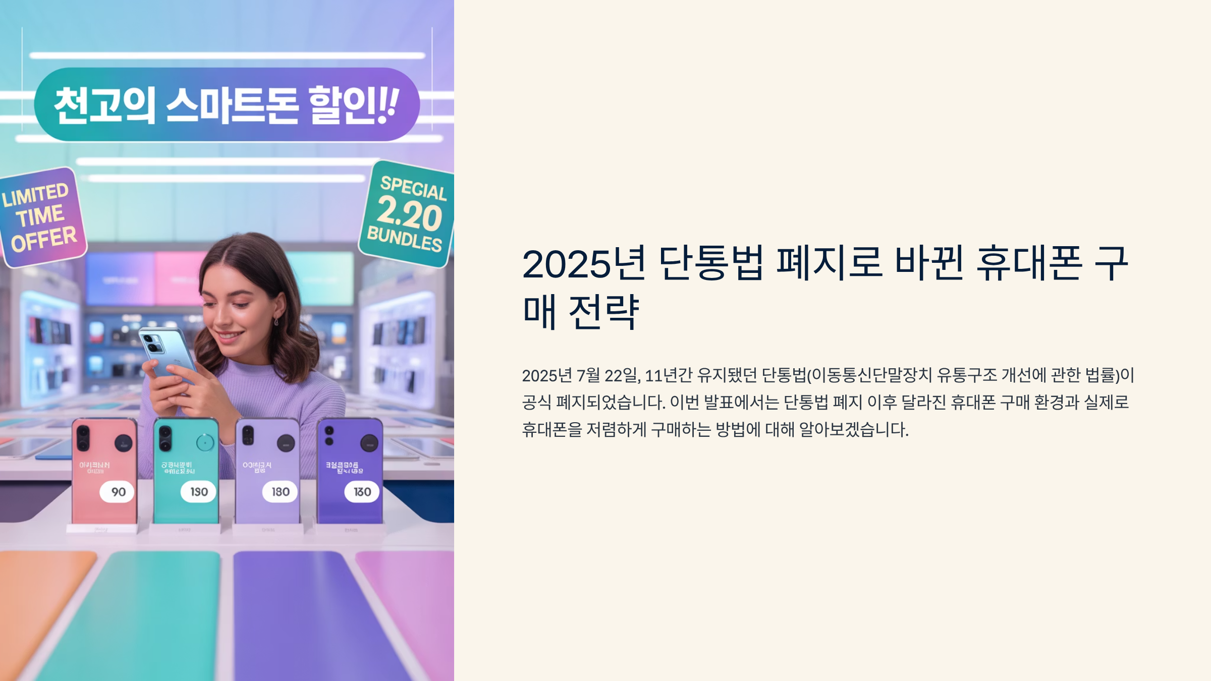 2025년 7월 22일, 무려 11년간 유지됐던 **단통법(이동통신단말장치 유통구조 개선에 관한 법률)**이 공식 폐지되었습니다. 이로 인해 휴대폰 가격 구조와 할인 방식에 큰 변화가 생겼습니다.