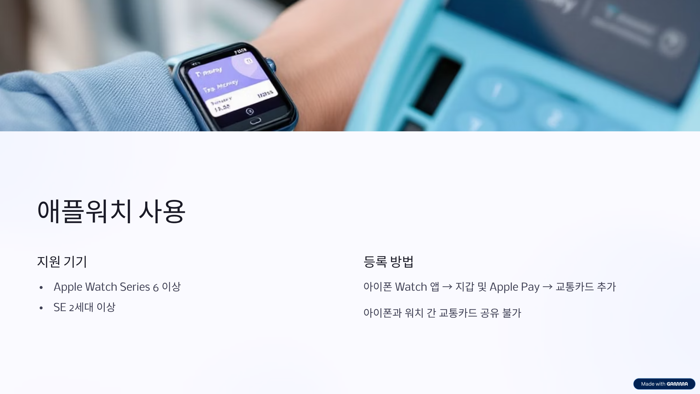 등록은 아이폰의 Watch 앱 → 지갑 및 Apple Pay → 교통카드 추가 순서로 진행할 수 있어요.