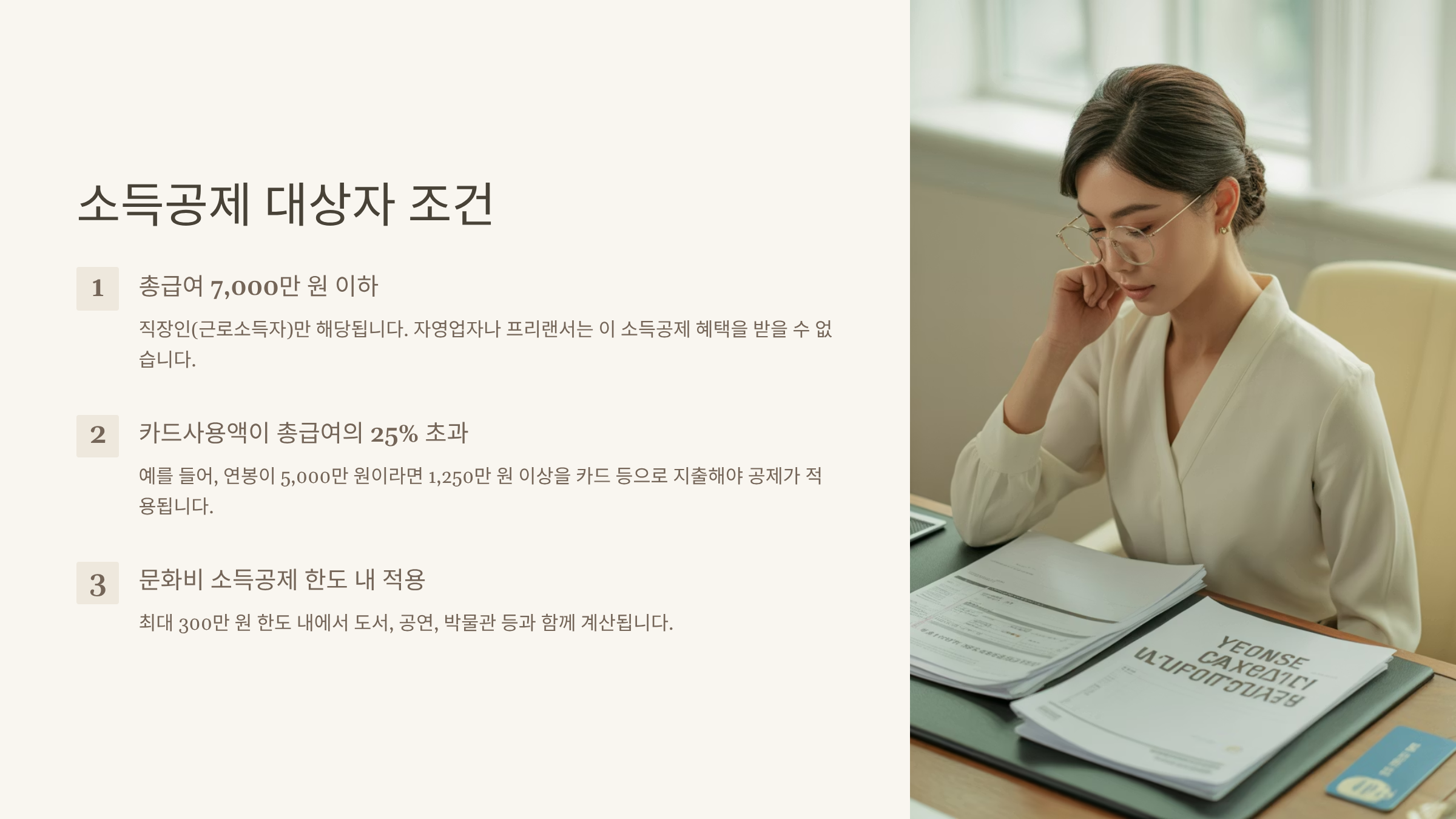 → 예: 연봉 5,000만 원이라면 1,250만 원 이상 카드 등으로 지출해야 공제 적용 가능 - 문화비 소득공제 한도 내 적용 (최대 300만 원)