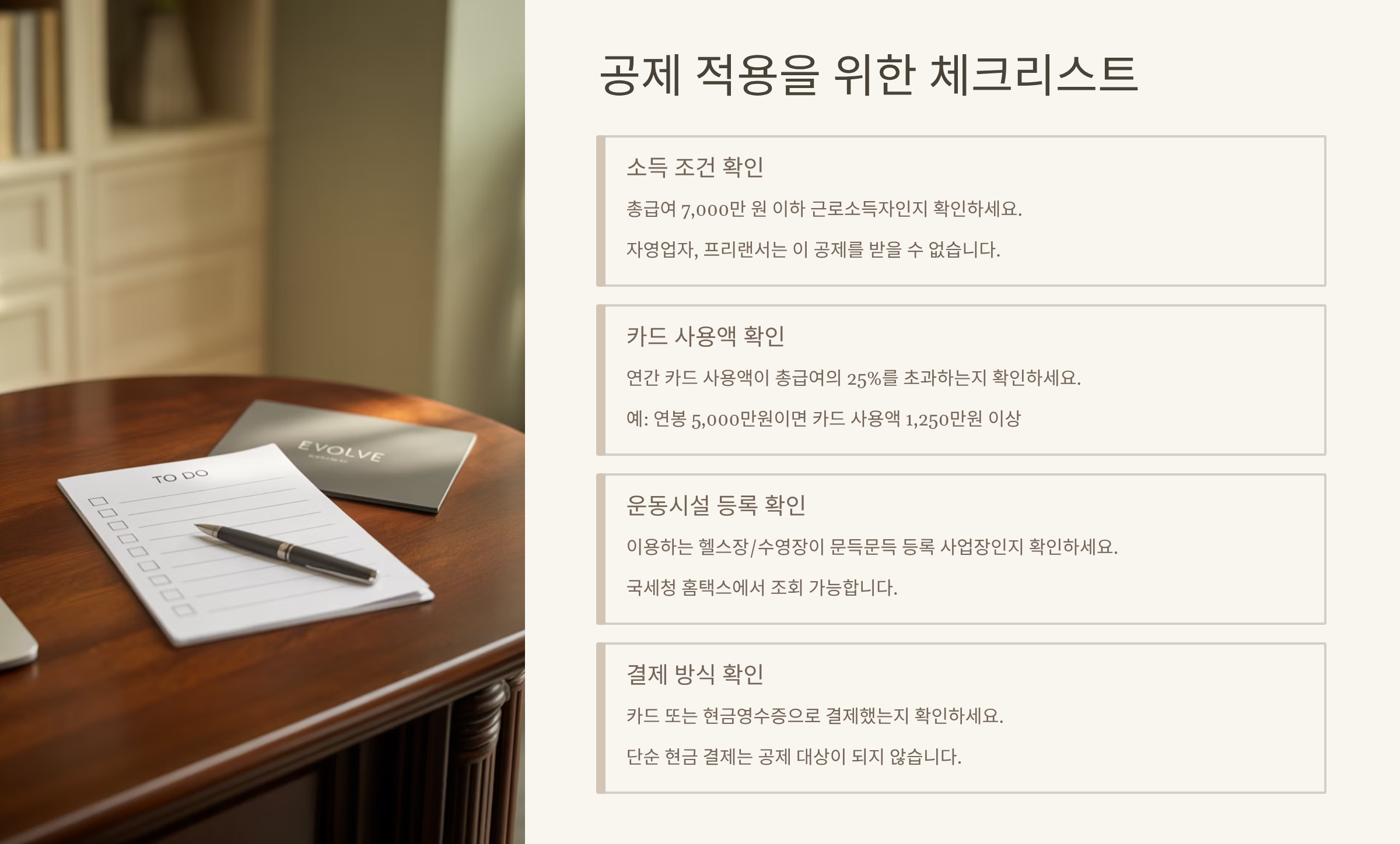 헬스장 수영장 소득공제는 모든 국민에게 적용되는 것이 아니라, 아래 세 가지 요건을 모두 충족한 근로소득자만 해당돼요.