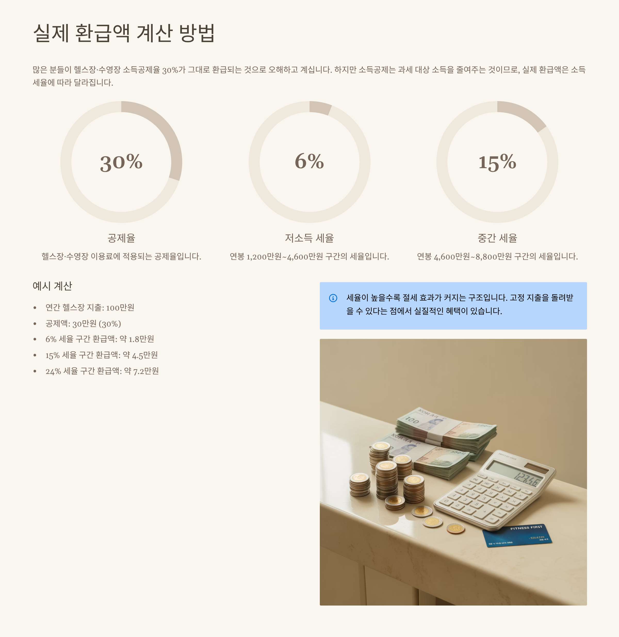 헬스장 수영장 소득공제는 소득에서 공제되는 항목이기 때문에 실제 환급액은 소득세율에 따라 달라져요.
