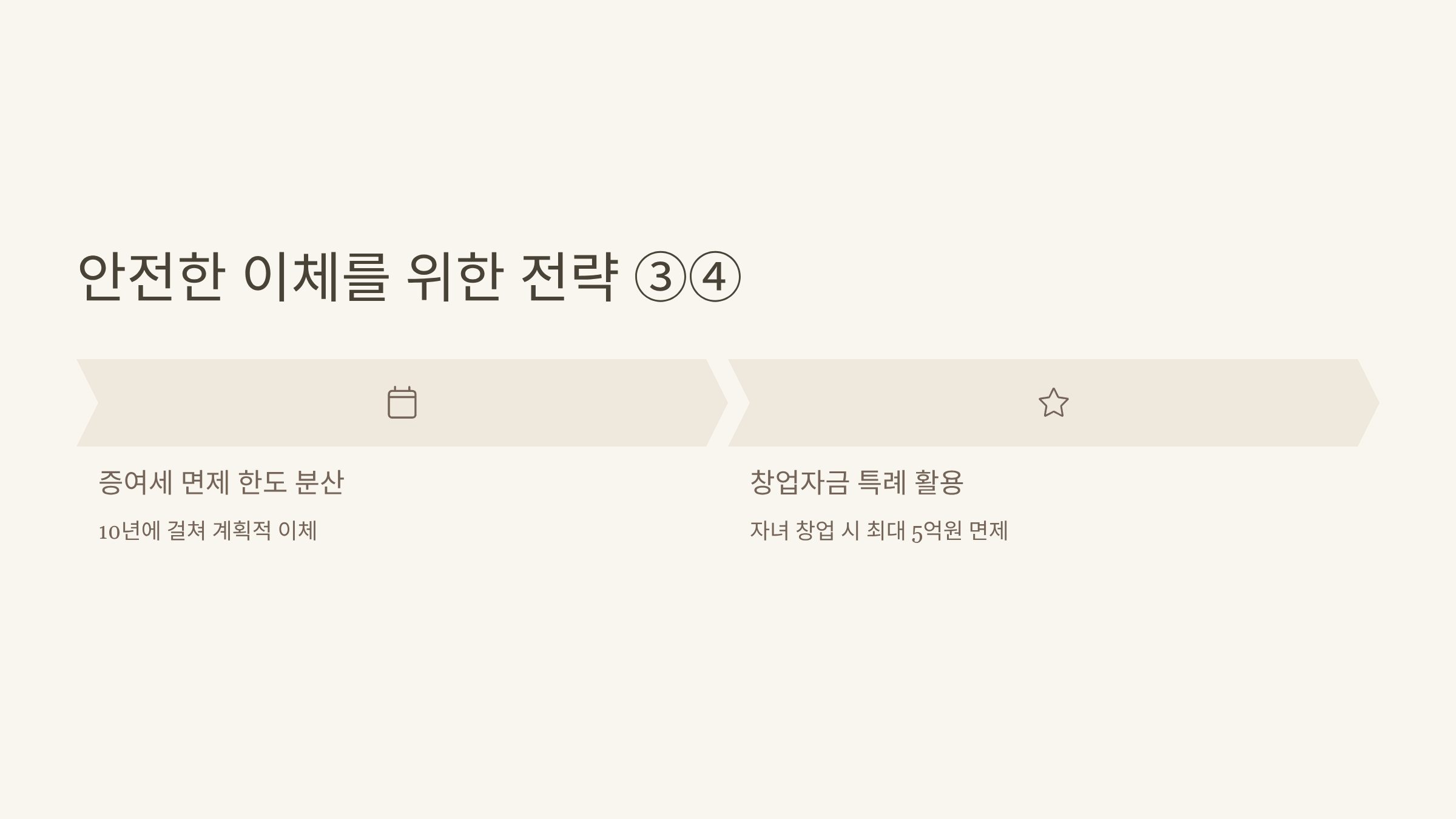 증여세 면제 한도를 기준으로, 자산 이전을 10년에 걸쳐 계획적으로 나누어 이체하는 것이 중요합니다. 배우자와 자녀 각각에 맞는 한도를 활용해 분산하는 전략이 필요합니다.