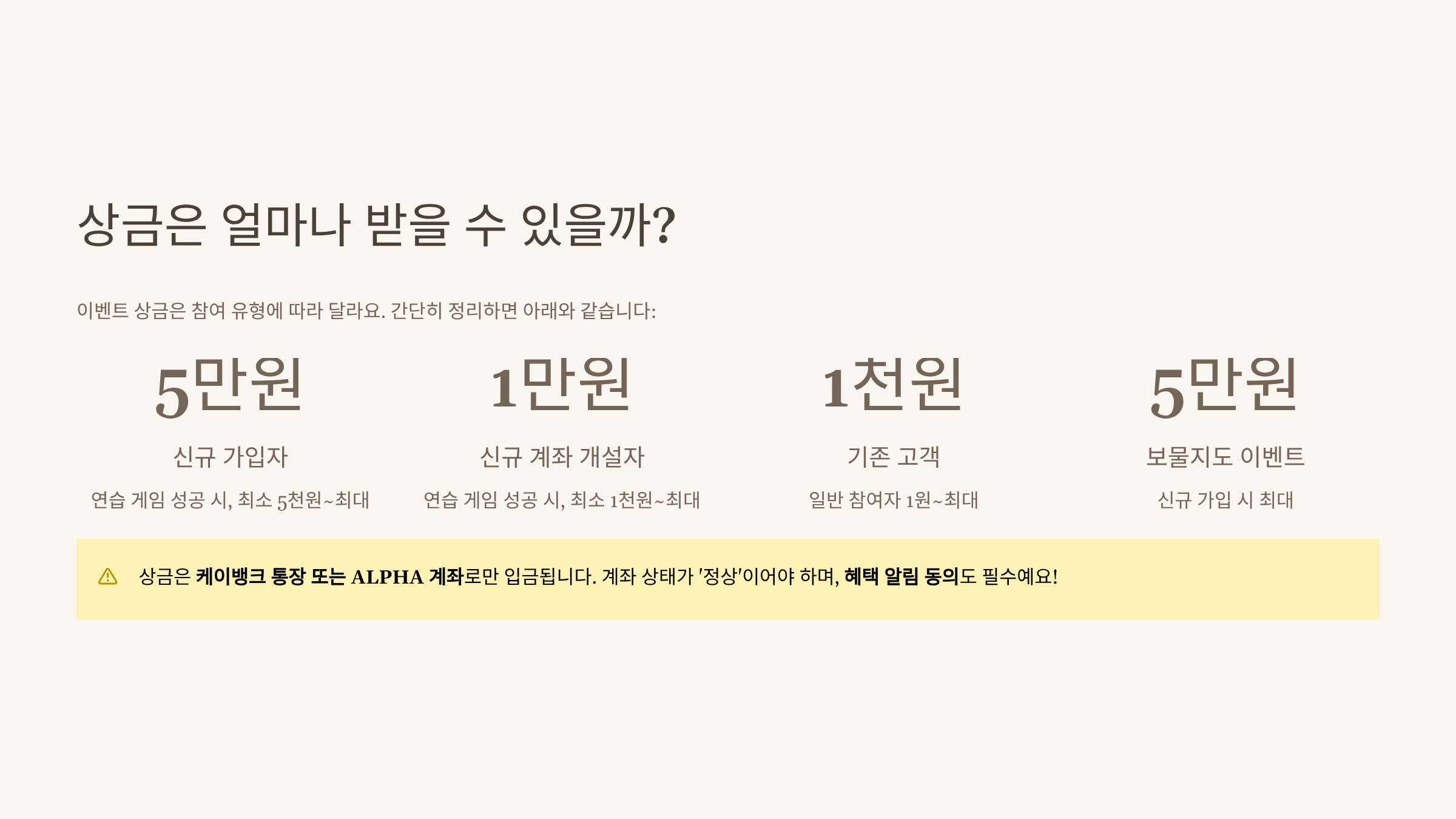 ※ 단, 상금은 케이뱅크 통장 또는 ALPHA 계좌로만 입금됩니다.