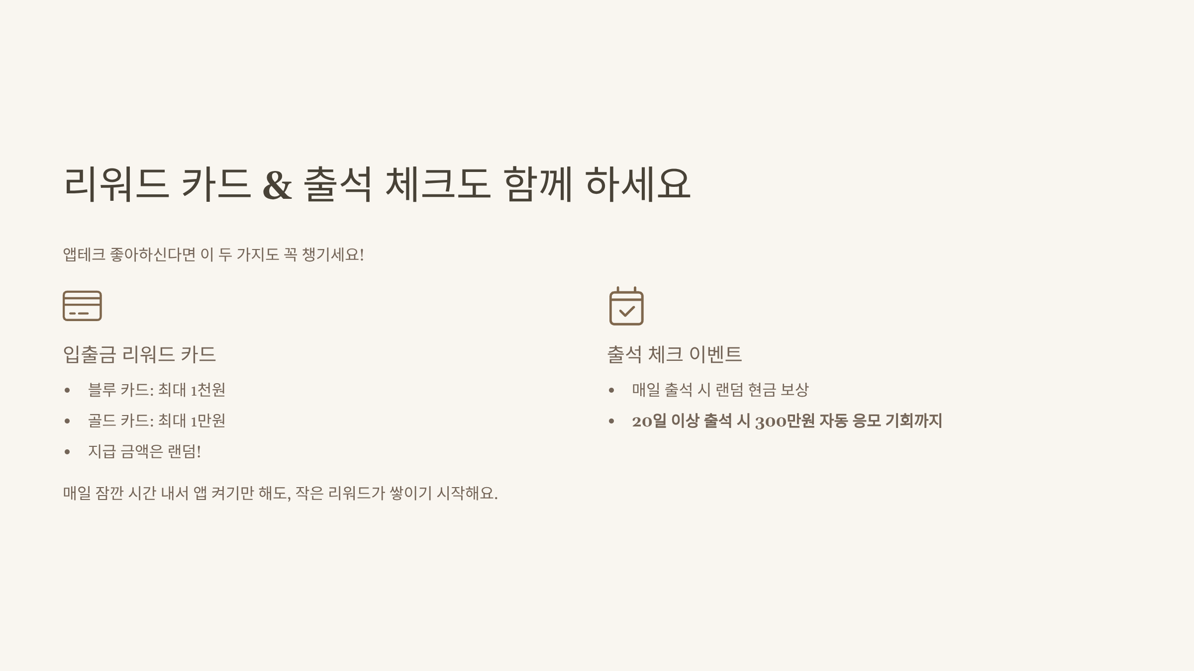 - 출석 체크: 현금 보상 + 300만원 이벤트 자동 응모