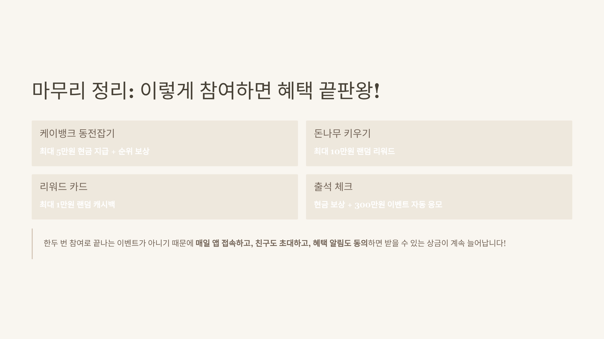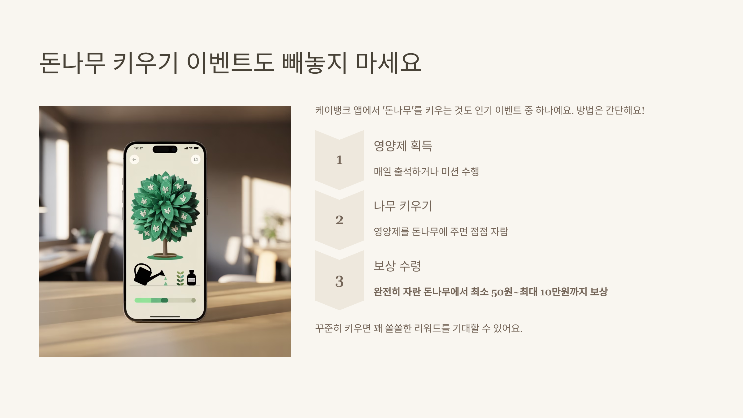 오늘은 케이뱅크에서 진행 중인 돈나무 키우기와 동전잡기 게임, 그리고 그 외에 챙길 수 있는 리워드 카드·출석 체크 혜택까지 깔끔하게 정리해드릴게요.
