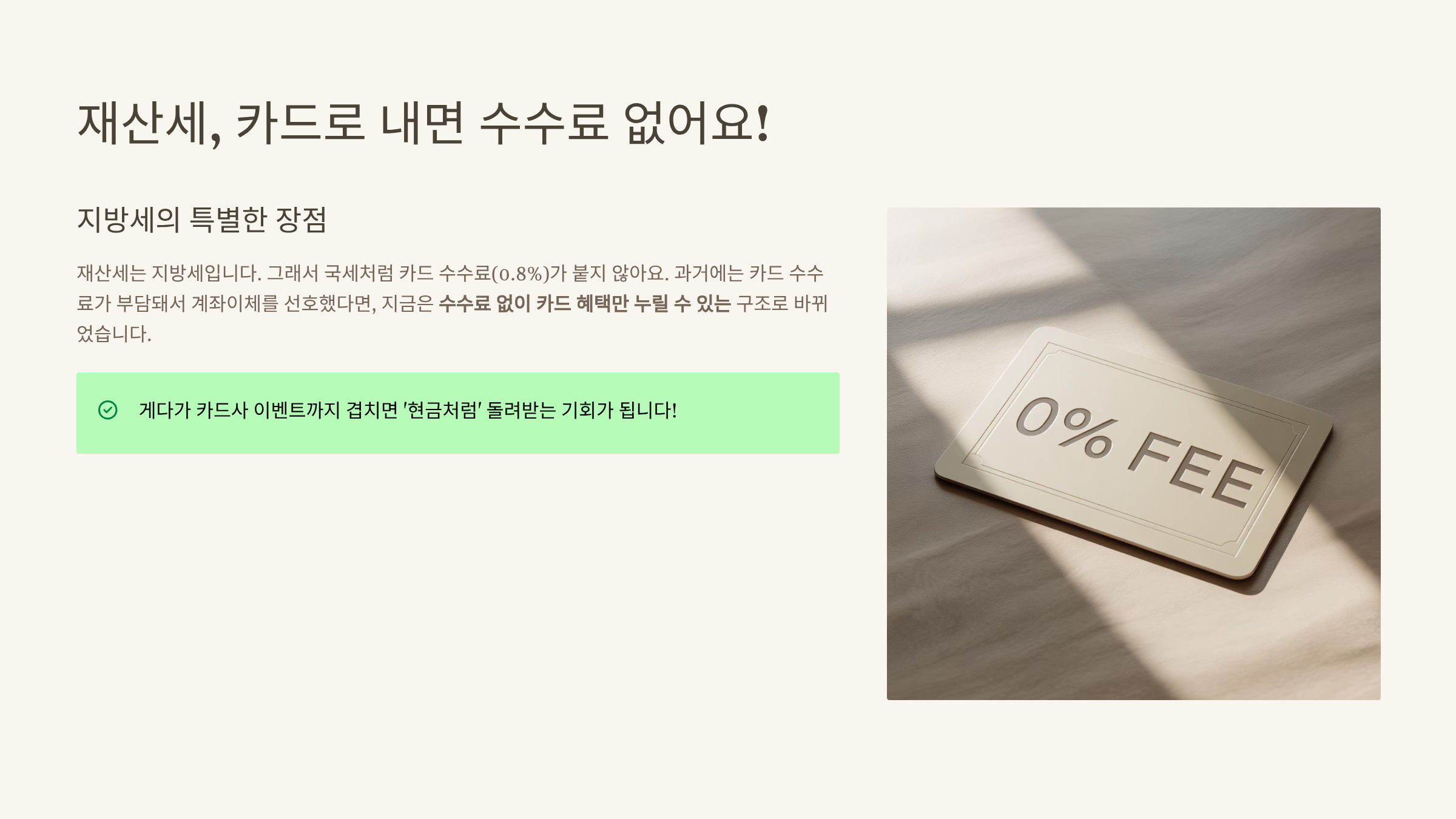 2025년 재산세 납부는 수수료 없이 카드 포인트·캐시백·할인까지 받을 수 있는 절호의 기회예요.