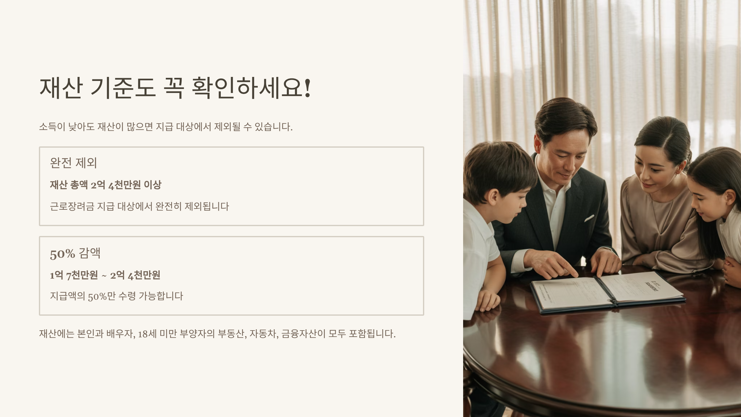 ✔ 재산 2.4억 초과 시 지급 제외, 1.7억~2.4억은 감액