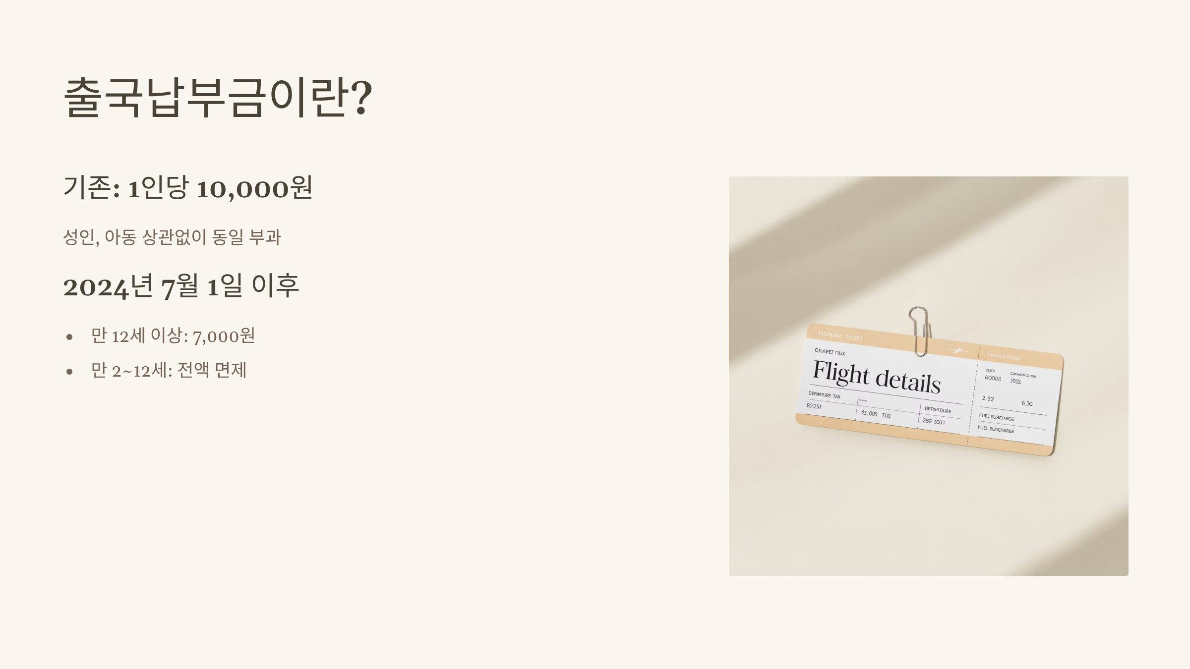 출국납부금은 항공권 요금에 자동으로 포함되는 세금 중 하나로, 공항시설 이용료와는 별도로 부과되는 항목입니다. 원래는 성인, 아동 상관없이 1인당 10,000원씩 부과되었어요. 그런데 2024년 7월 1일부터 관련 법령이 개정되면서 부과 기준에 변화가 생겼습니다.