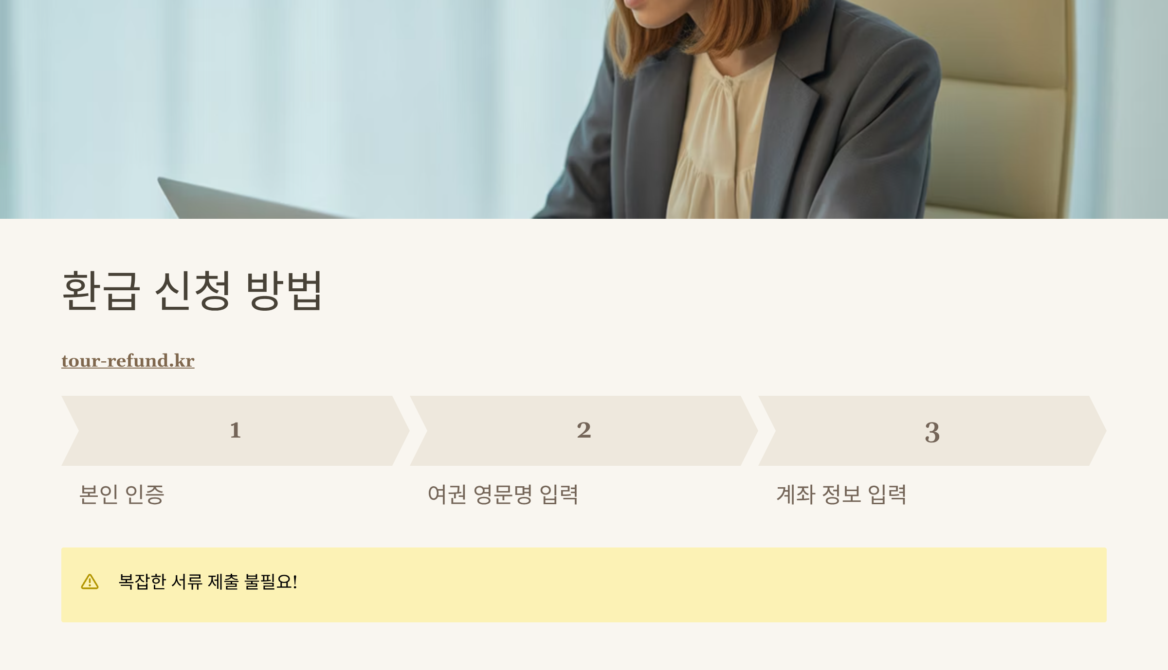 사이트에 접속한 후, '환급신청' 버튼을 누르고 본인 인증을 거치면 여권 영문 이름과 환급받을 본인 명의 계좌 정보만 입력하면 끝입니다. 주민등록등본, 항공권 영수증 같은 복잡한 서류는 필요하지 않아요.