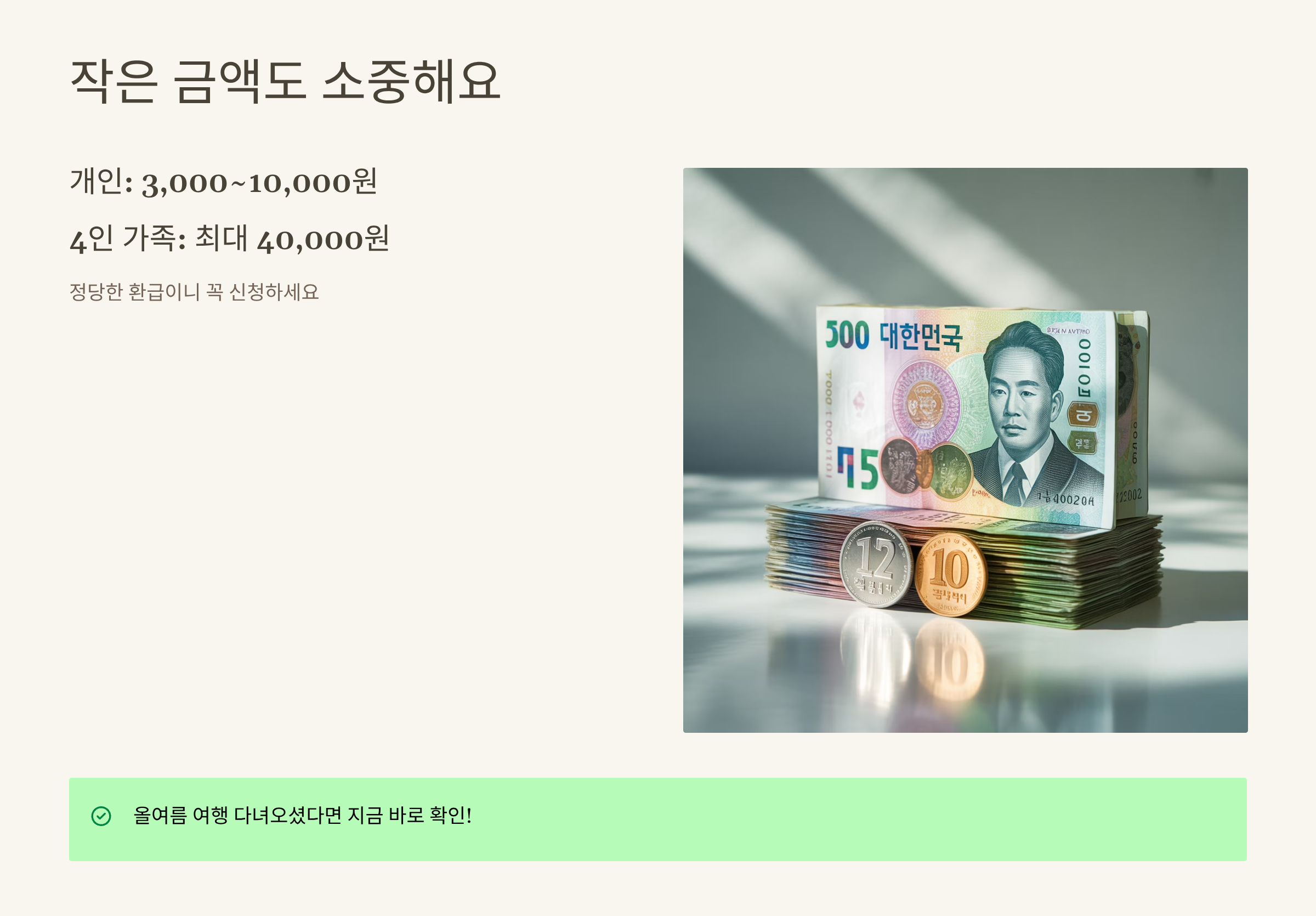 실제로 환급되는 금액은 1인당 3,000원 또는 10,000원이라서 적은 금액이라고 생각할 수 있어요. 하지만 3~4인 가족이 모두 해당되면 총 환급액이 3~4만 원 이상이 될 수 있어요. 가족 단위 여행이 잦은 분들이라면 놓치기엔 아까운 금액이죠.
