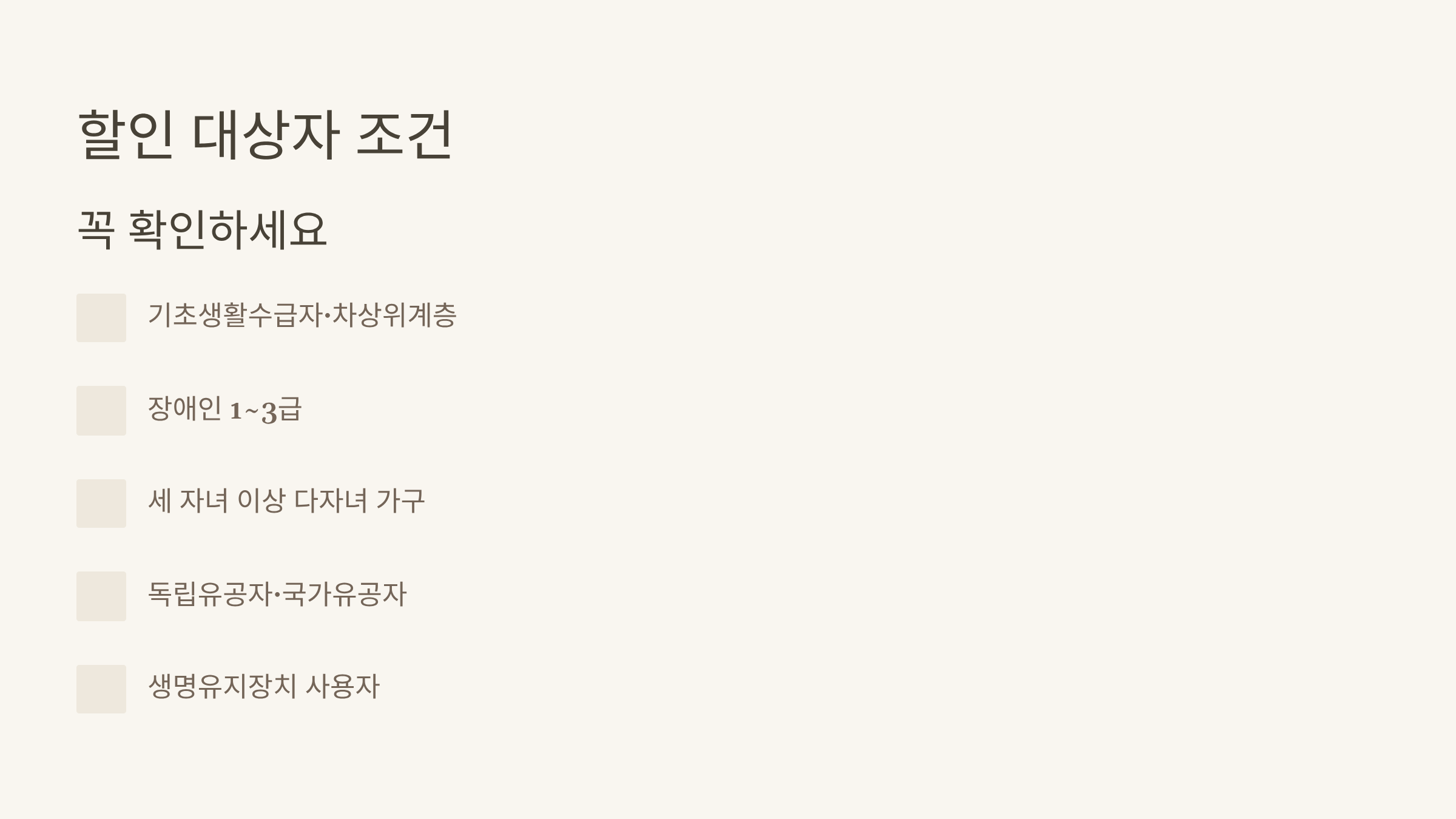 - 해당 자격 증명서 (예: 수급자 증명서, 장애인 등록증, 유공자 증서 등)