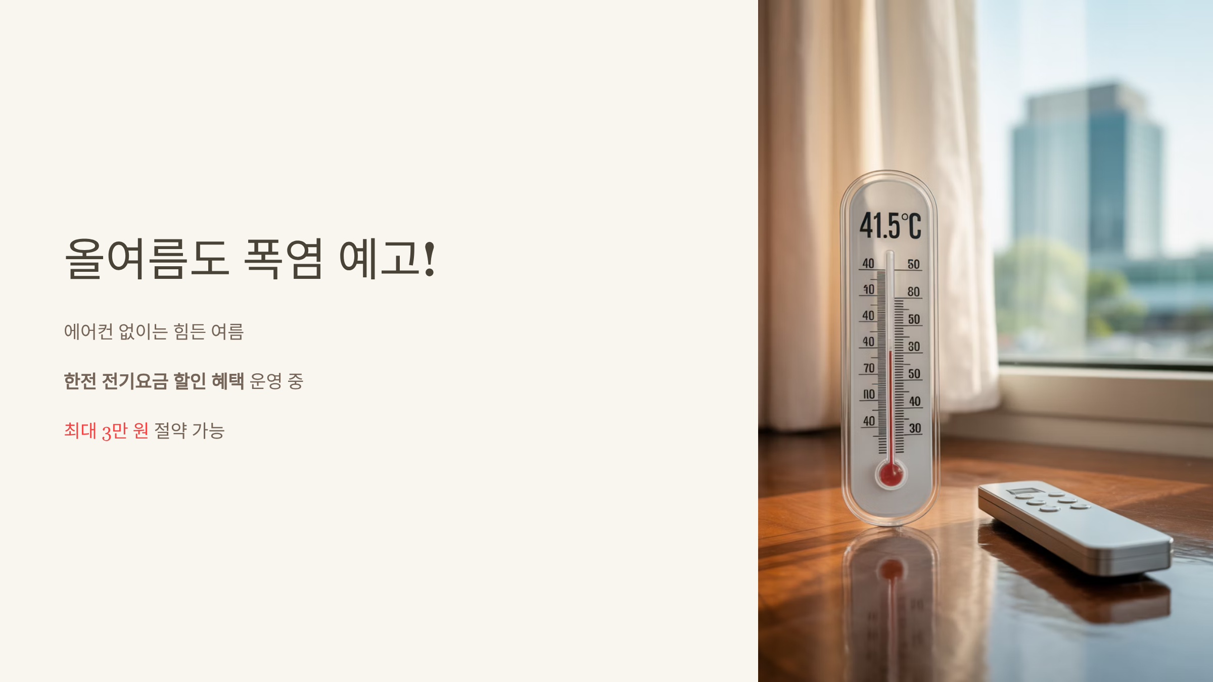 이 외에도 폭염 상황이 심각한 경우, 정부와 한전이 협의를 통해 일반 가구에도 한시적 전기요금 할인을 적용할 수 있으니, 최신 공지사항을 꼭 확인해주세요.