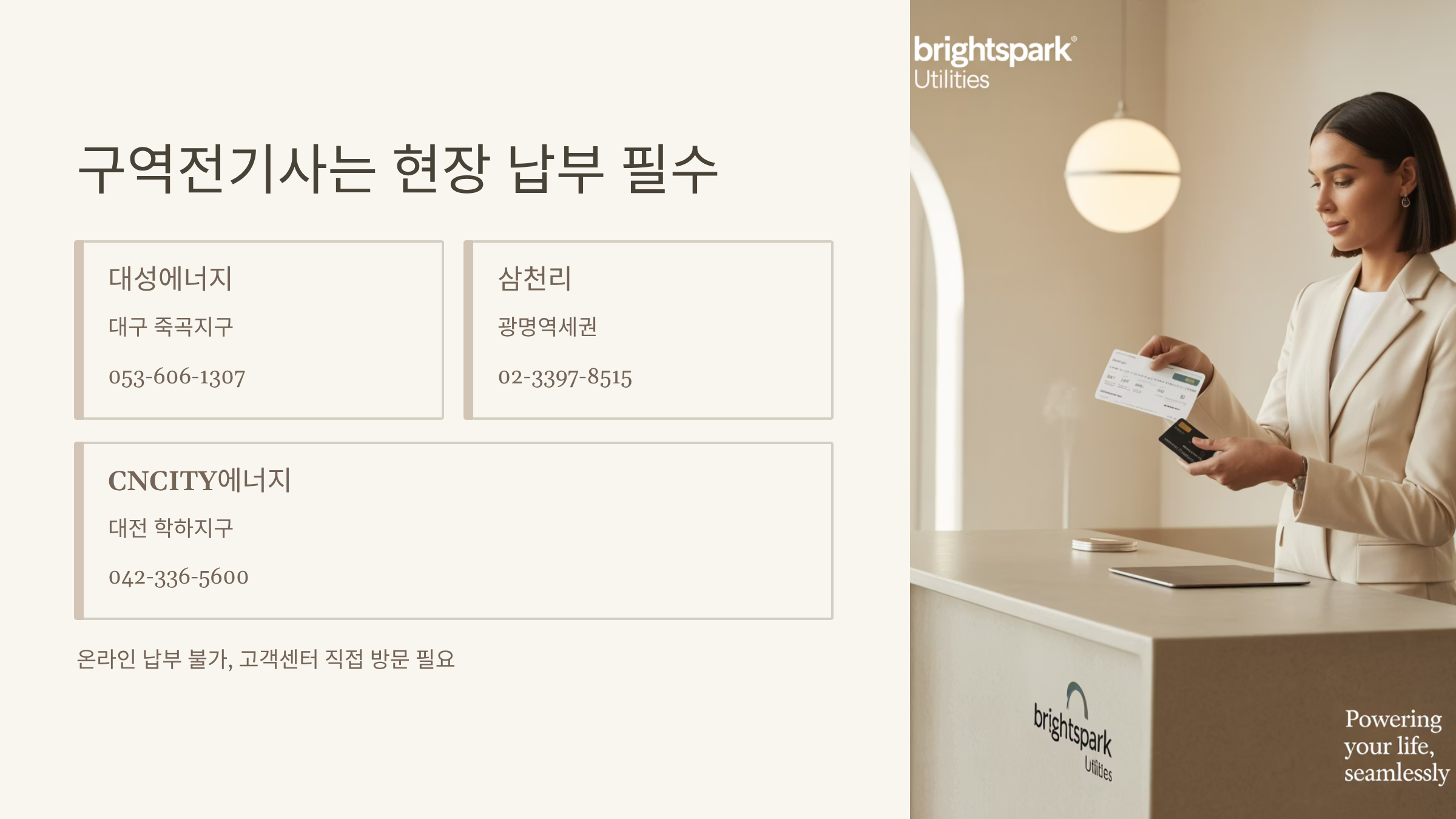 전국에는 한국전력이 아닌 민간 전력회사가 전기를 공급하는 구역전기사 고객들도 있습니다. 예를 들어 대구 죽곡의 대성에너지, 광명역세권의 삼천리, 대전 학하지구의 CNCITY에너지 등이 이에 해당합니다.