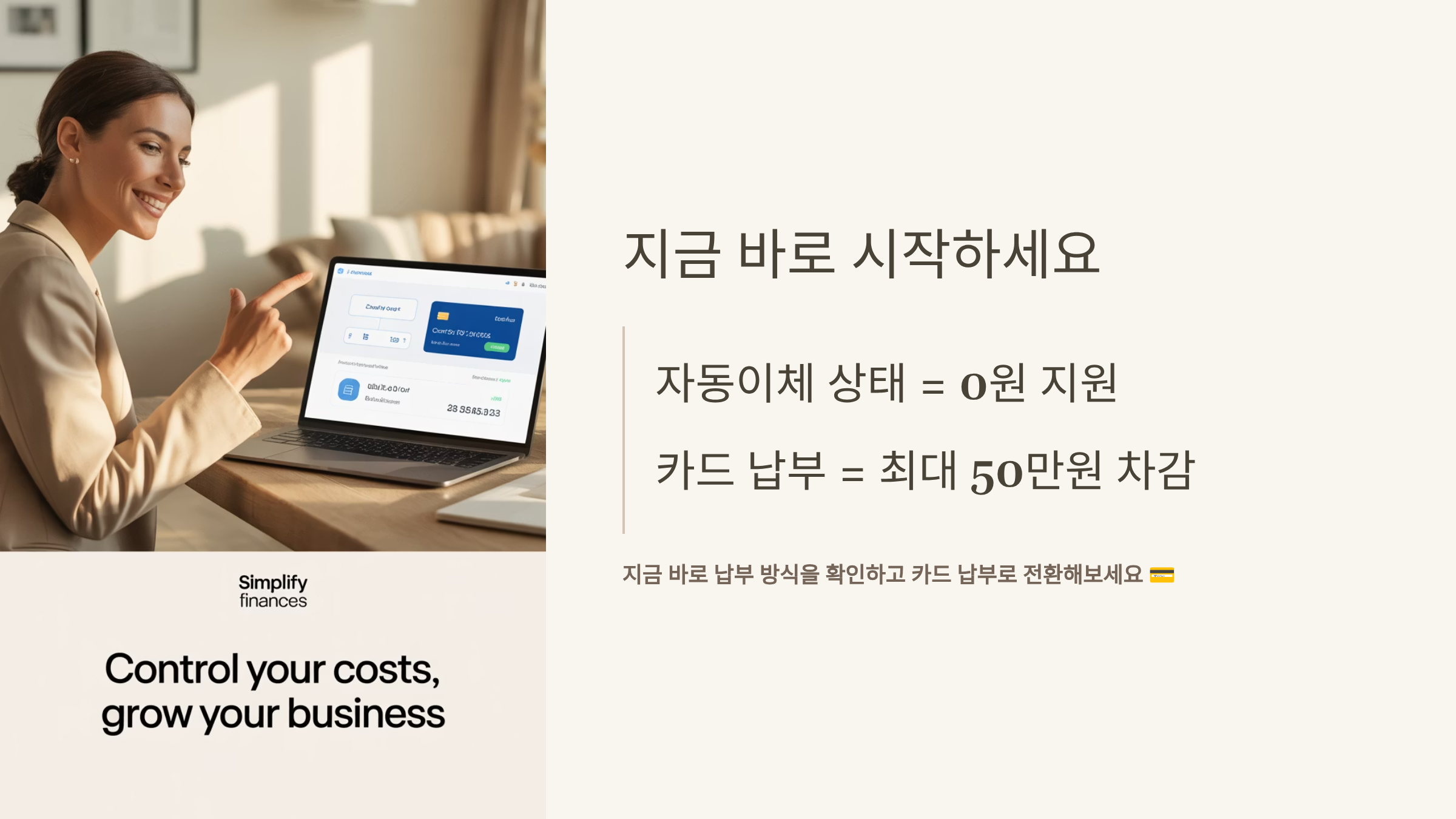 자동이체 상태 그대로 두면 0원 지원이 되고, 카드로 납부하면 최대 50만 원까지 자동 차감됩니다. 크레딧은 시간과 노력을 조금만 투자하면 사업장의 고정비용을 줄일 수 있는 좋은 기회입니다.