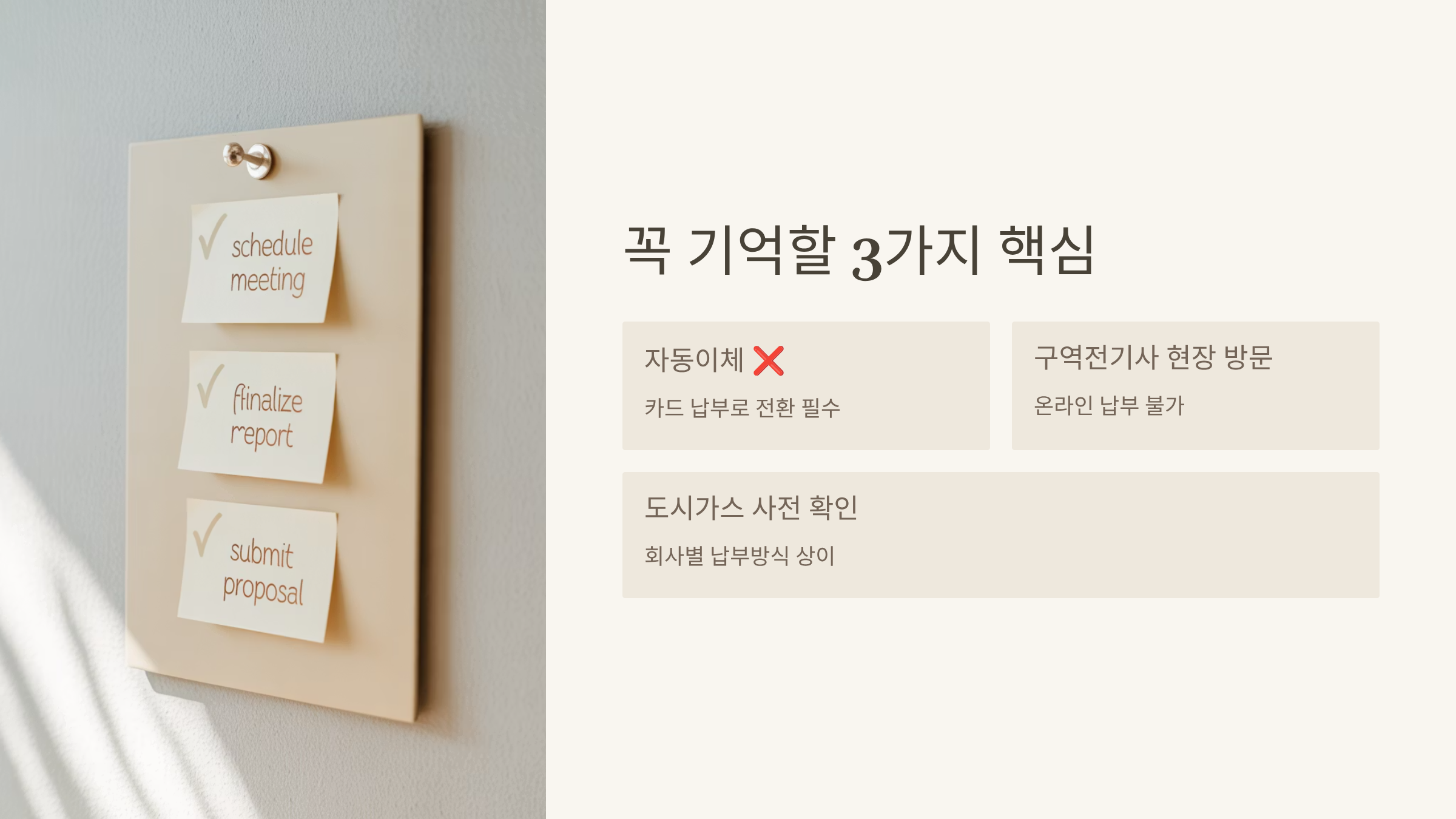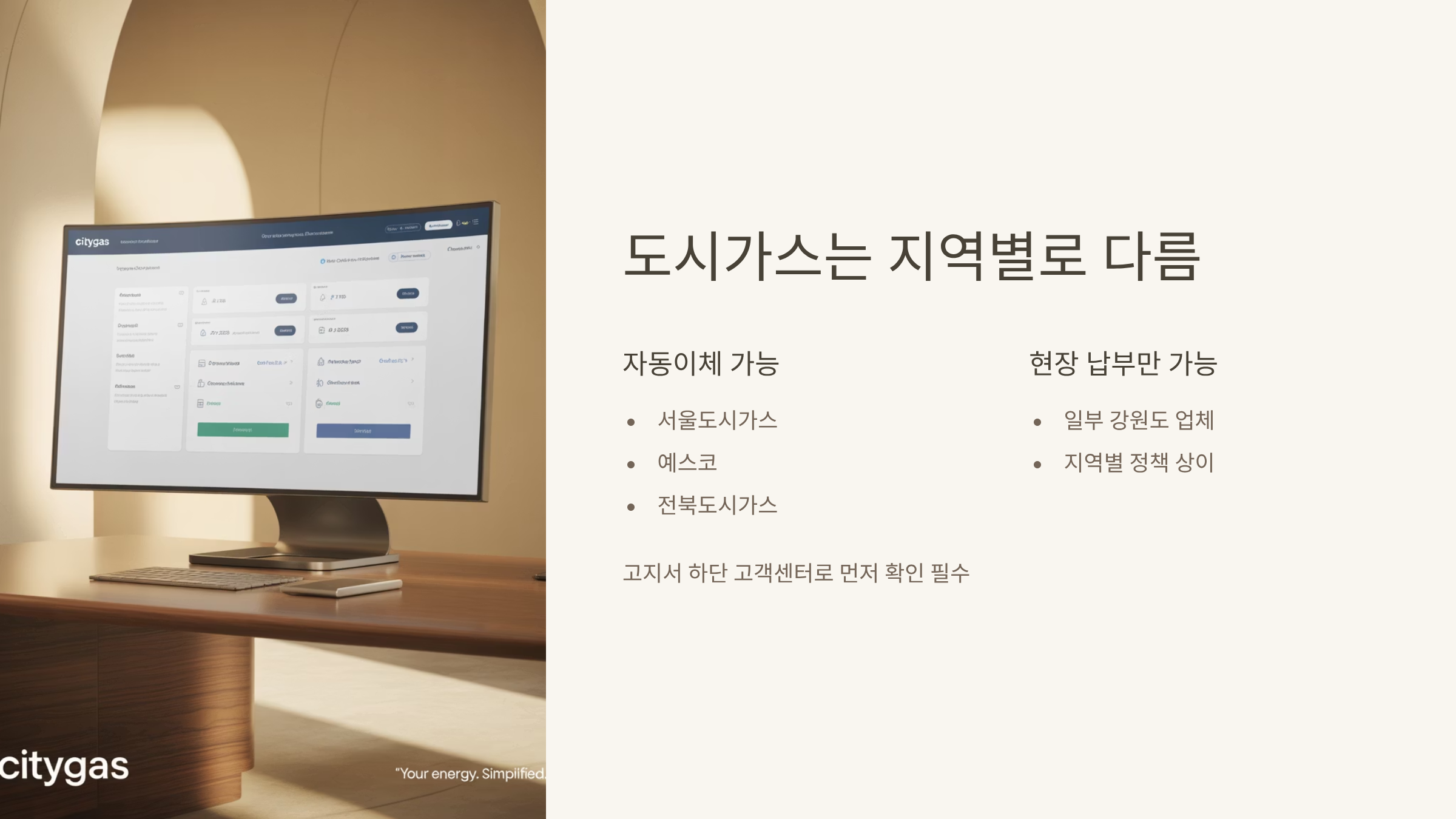 하지만 일부 업체는 카드 자동이체를 지원하지 않고, 고객센터 방문 납부만 가능한 곳도 있습니다. 예를 들어 강원도의 일부 도시가스사는 주택용 계약자만 가능하거나, 모바일 고지서로만 청구되는 곳도 있어 사전에 확인이 필요합니다.