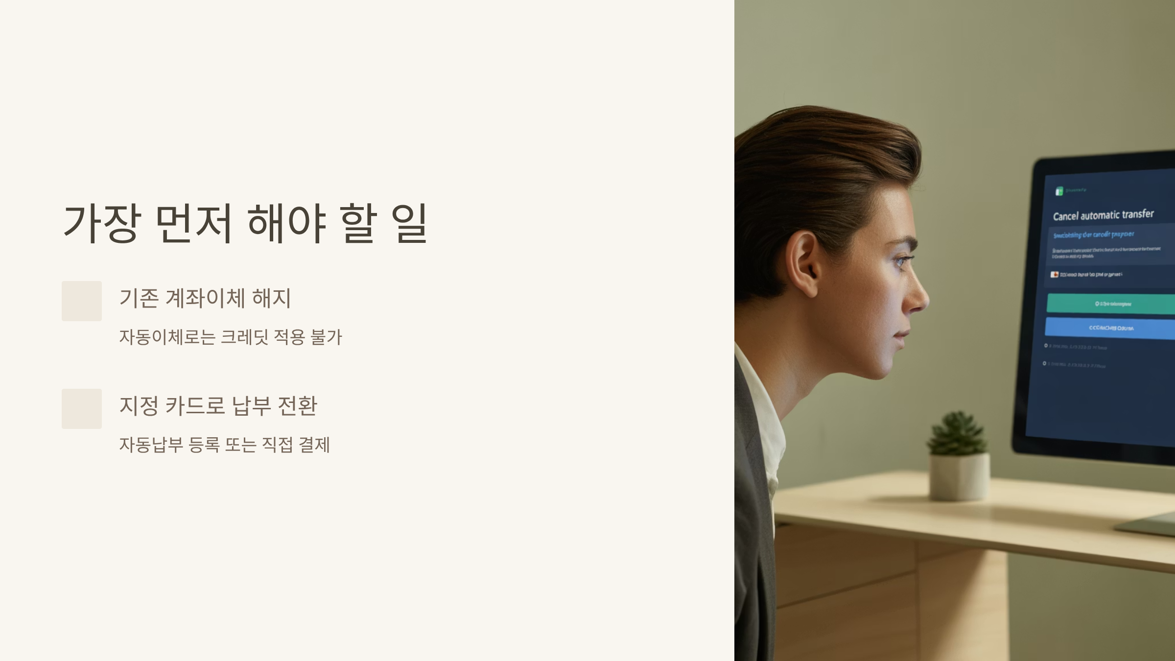 또한 기존 계좌이체 상태라면 반드시 해지해야 하며, 카드 결제가 완료된 이후에야 크레딧이 적용됩니다. 업체마다 운영 방식이 다를 수 있으므로 납부 전 반드시 전화로 확인해보는 것이 좋습니다.