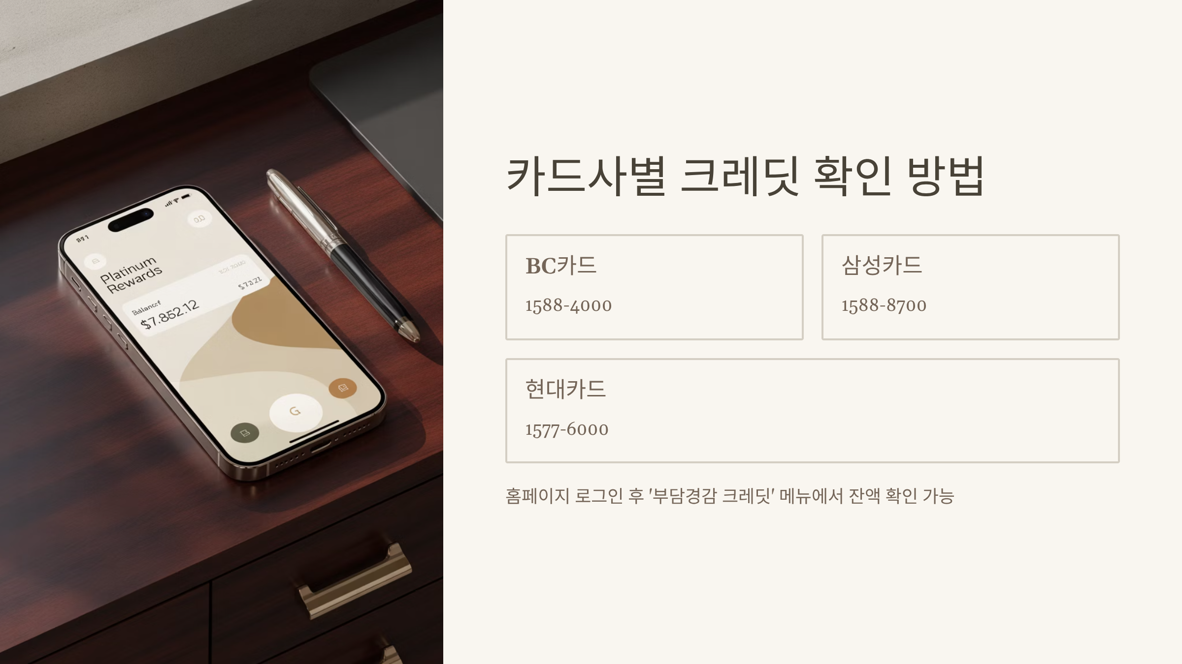 예를 들어 BC카드는 1588-4000번, 삼성카드는 1588-8700번, 현대카드는 1577-6000번을 통해 상담이 가능합니다. 홈페이지에서도 로그인 후 '포인트 확인' 또는 '부담경감 크레딧' 메뉴에서 바로 확인할 수 있습니다. 납부 전 꼭 체크하세요.
