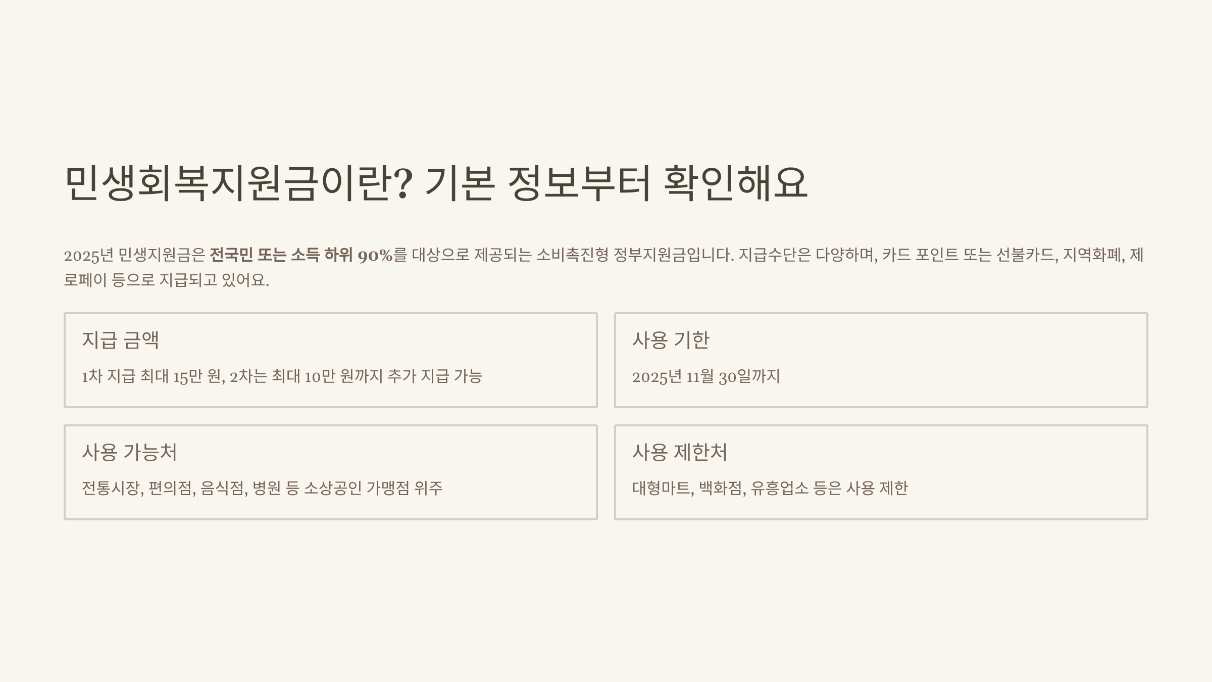 2025년 민생지원금은 **전국민 또는 소득 하위 90%**를 대상으로 제공되는 소비촉진형 정부지원금입니다.