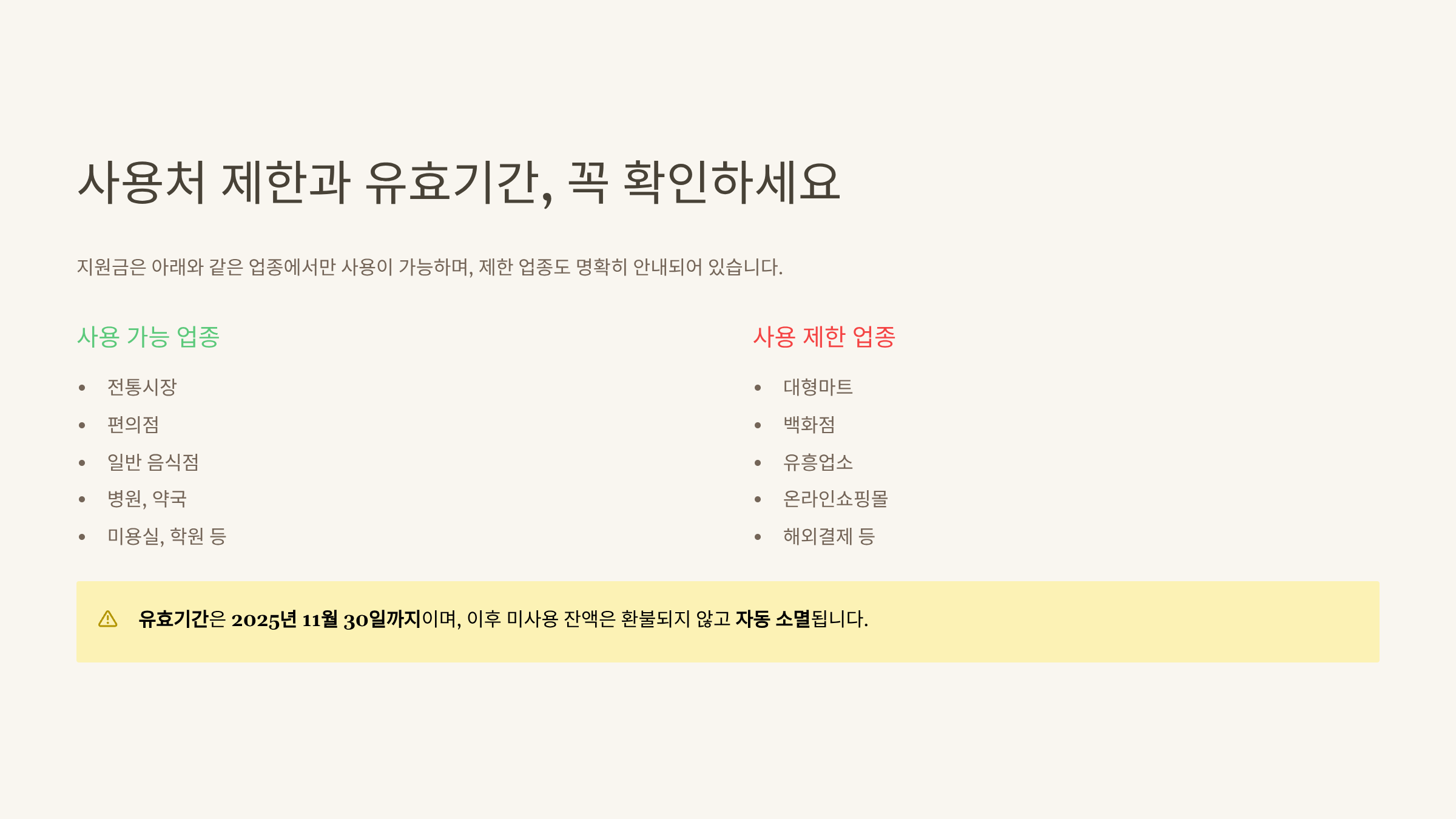 지원금은 아래와 같은 업종에서만 사용이 가능하며, 제한 업종도 명확히 안내되어 있습니다.