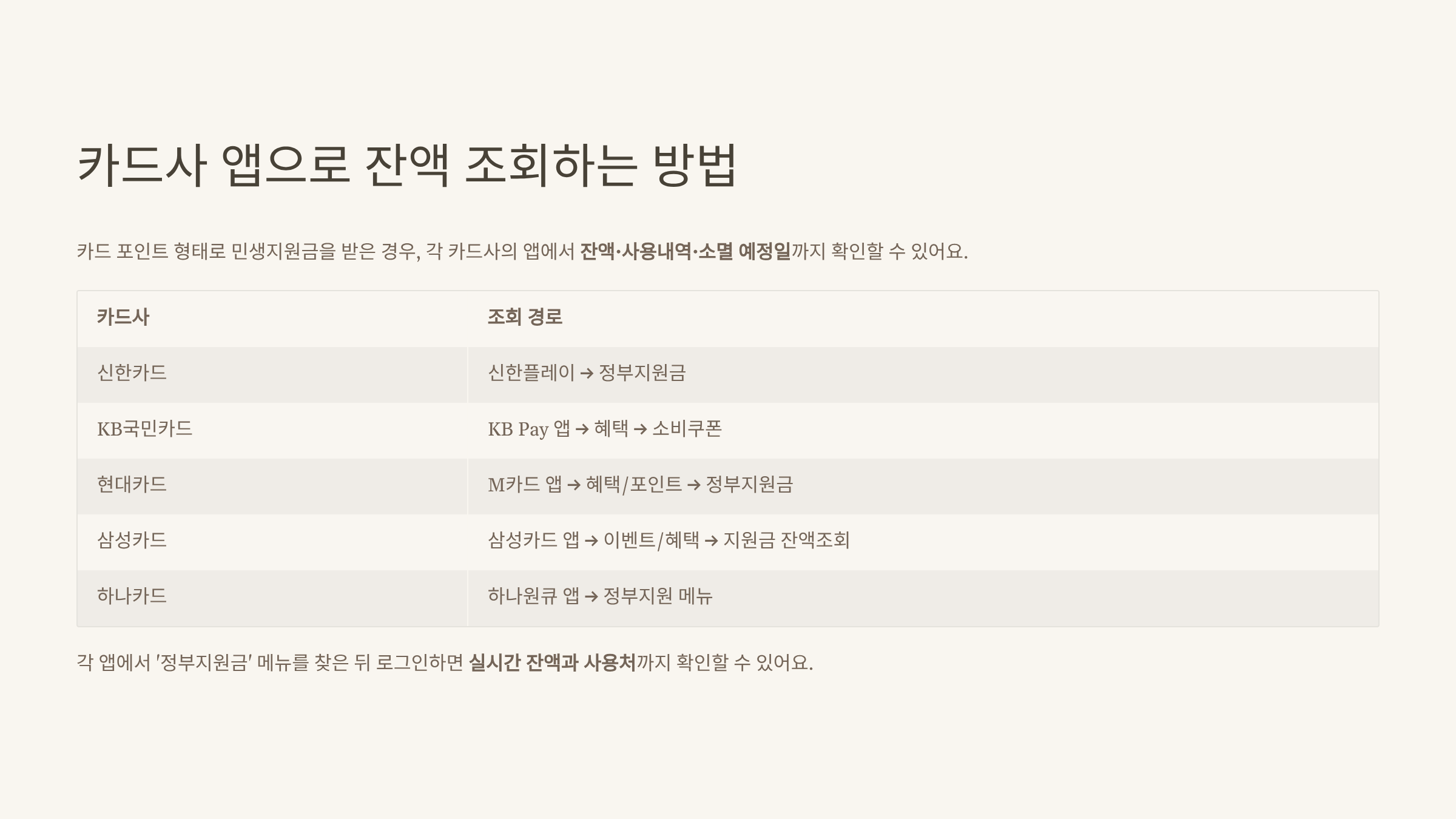 카드 포인트 형태로 민생지원금을 받은 경우, 각 카드사의 앱에서 잔액·사용내역·소멸 예정일까지 확인할 수 있어요.