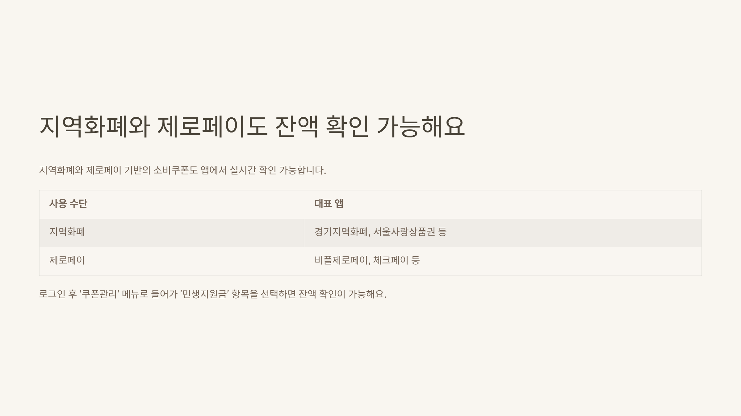 로그인 후 ‘쿠폰관리’ 메뉴로 들어가 ‘민생지원금’ 항목을 선택하면 잔액 확인이 가능해요.