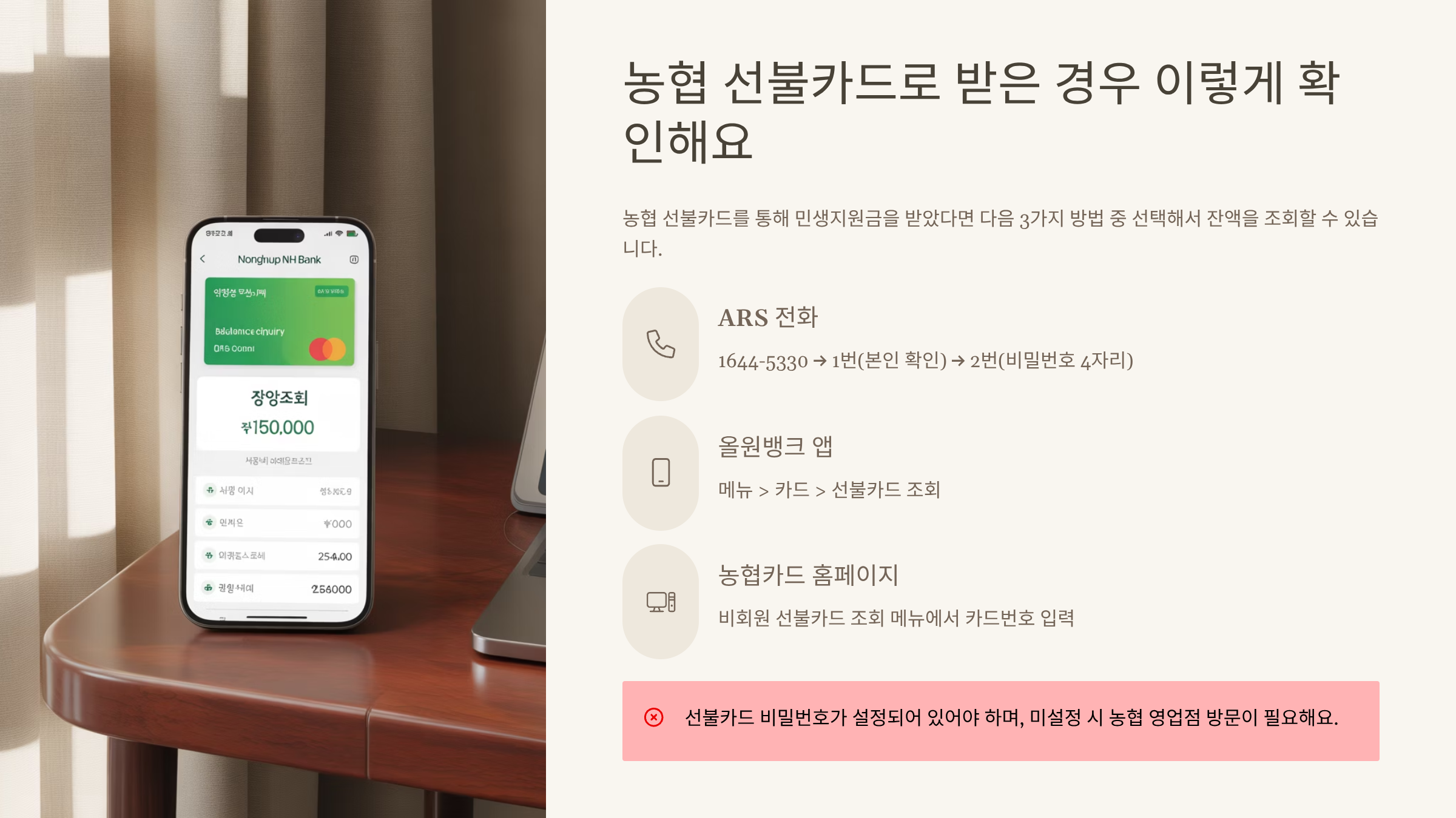 농협 선불카드를 통해 민생지원금을 받았다면 다음 3가지 방법 중 선택해서 잔액을 조회할 수 있습니다.