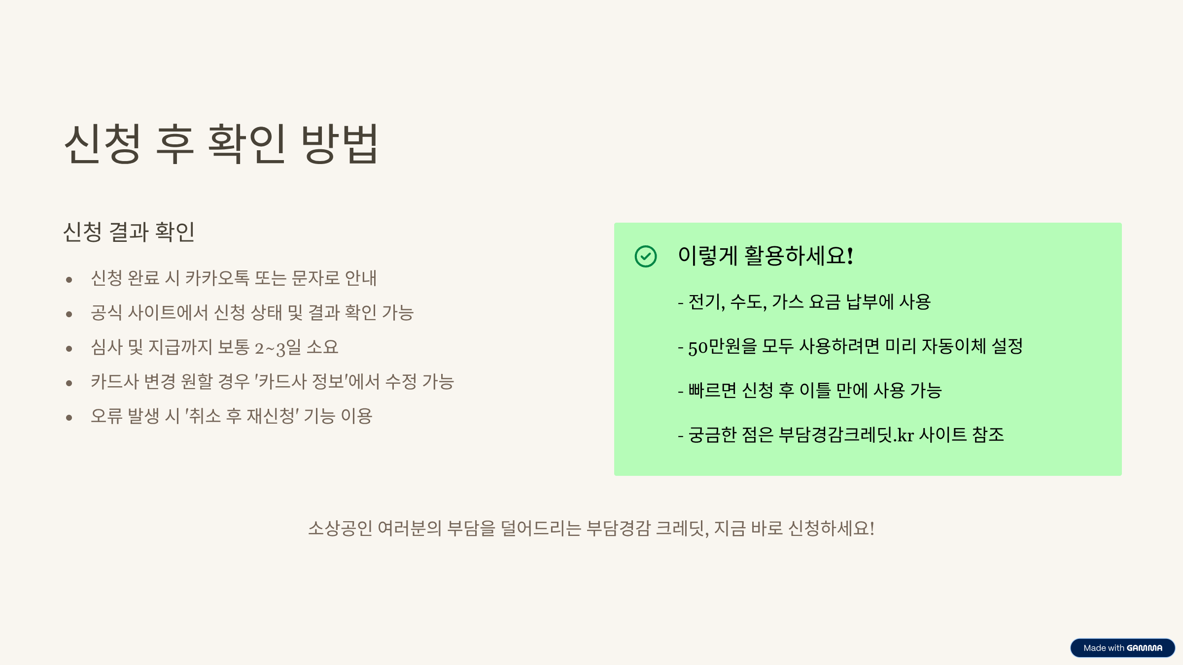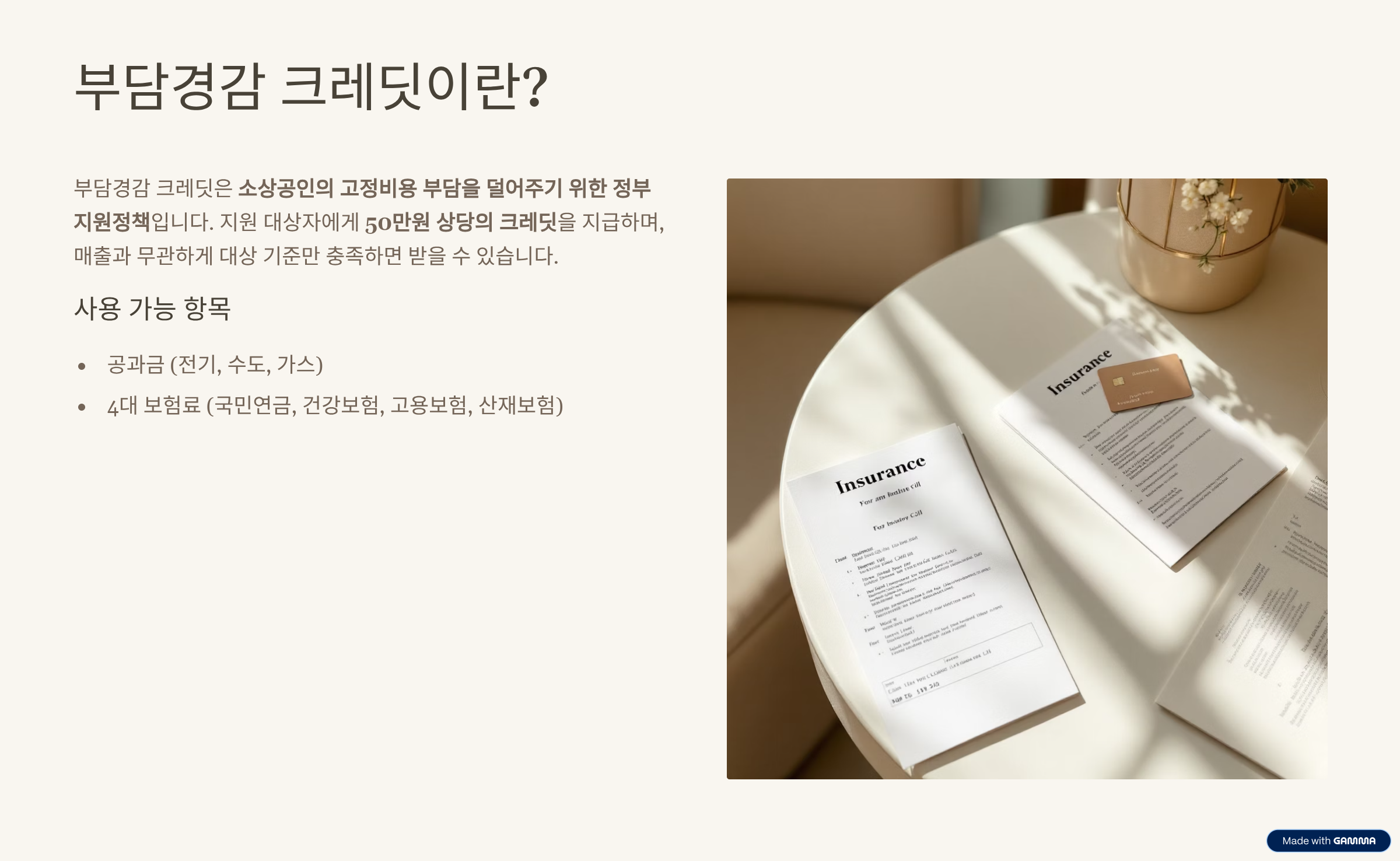 4대 보험료와 공과금에 직접 쓸 수 있는 1인당 50만원의 크레딧이 지원되는 이번 제도, 어떻게 신청하고 어디에 쓸 수 있는지 궁금하셨다면 이번 글 꼭 읽어보세요!