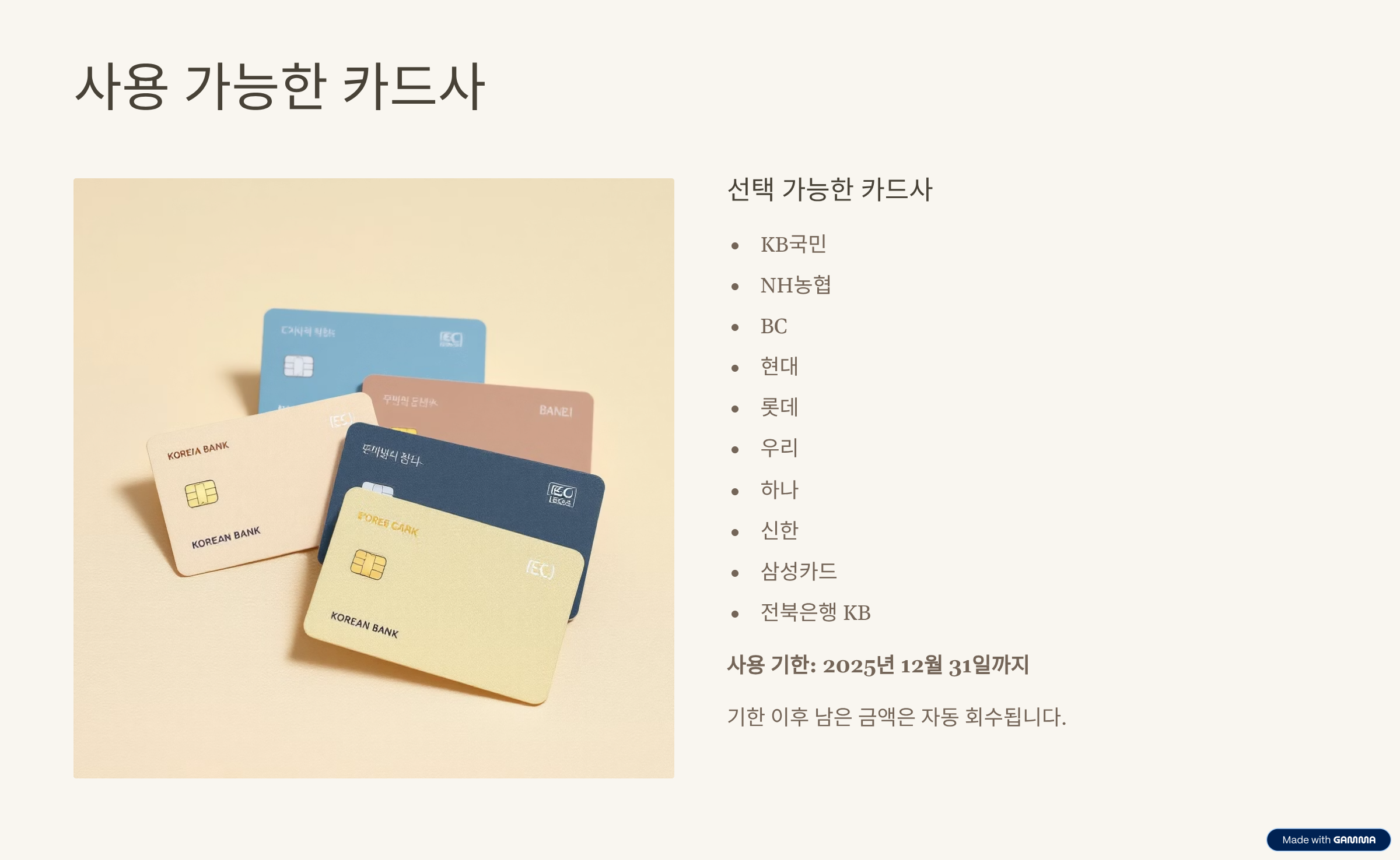 사용 가능한 카드와 주의사항