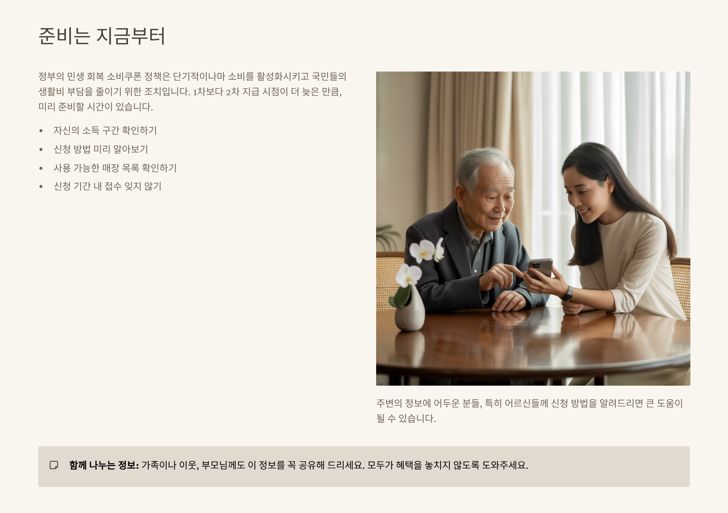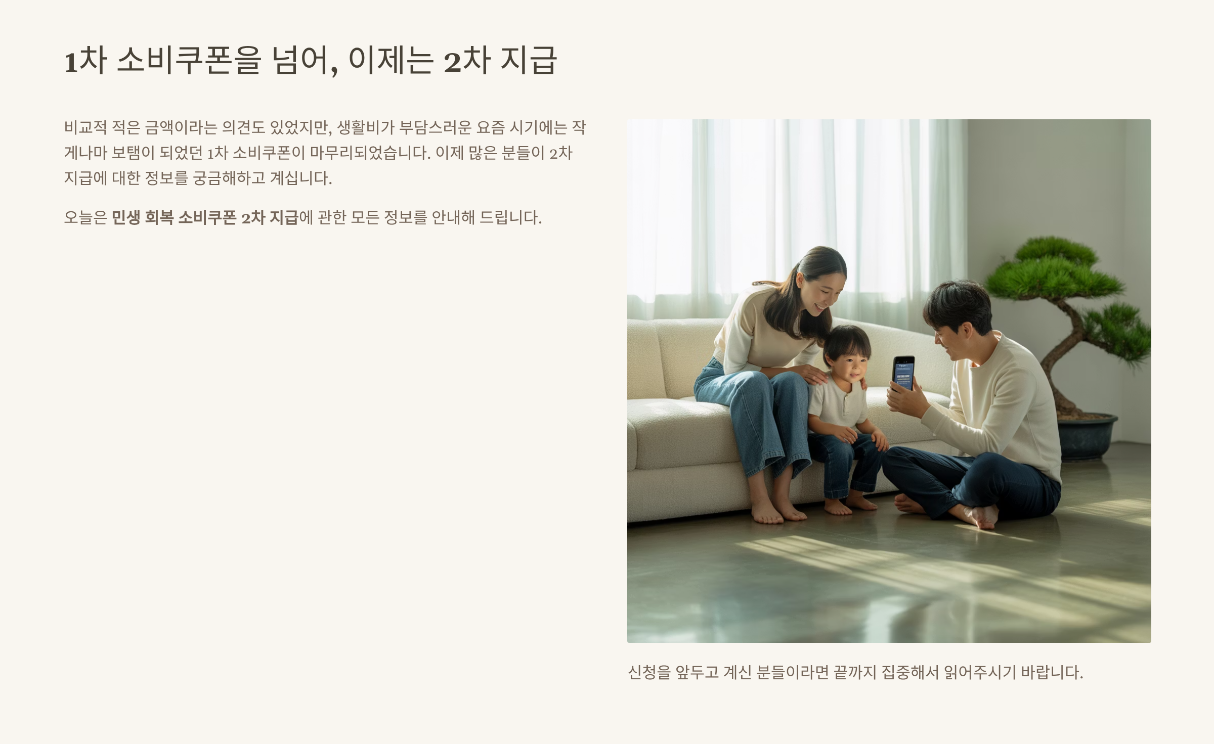 정부의 민생 회복 소비쿠폰 정책은 단기적이나마 소비를 활성화시키고 국민들의 생활비 부담을 줄이기 위한 조치로 해석됩니다. 1차보다 2차 지급 시점이 더 늦은 만큼, 준비할 시간도 여유가 있어요. 자신이 어느 소득 구간에 속하는지, 어떤 방식으로 신청할지, 그리고 어느 매장에서 사용할지 미리 확인해두면 더욱 수월하게 이용하실 수 있을 거예요.