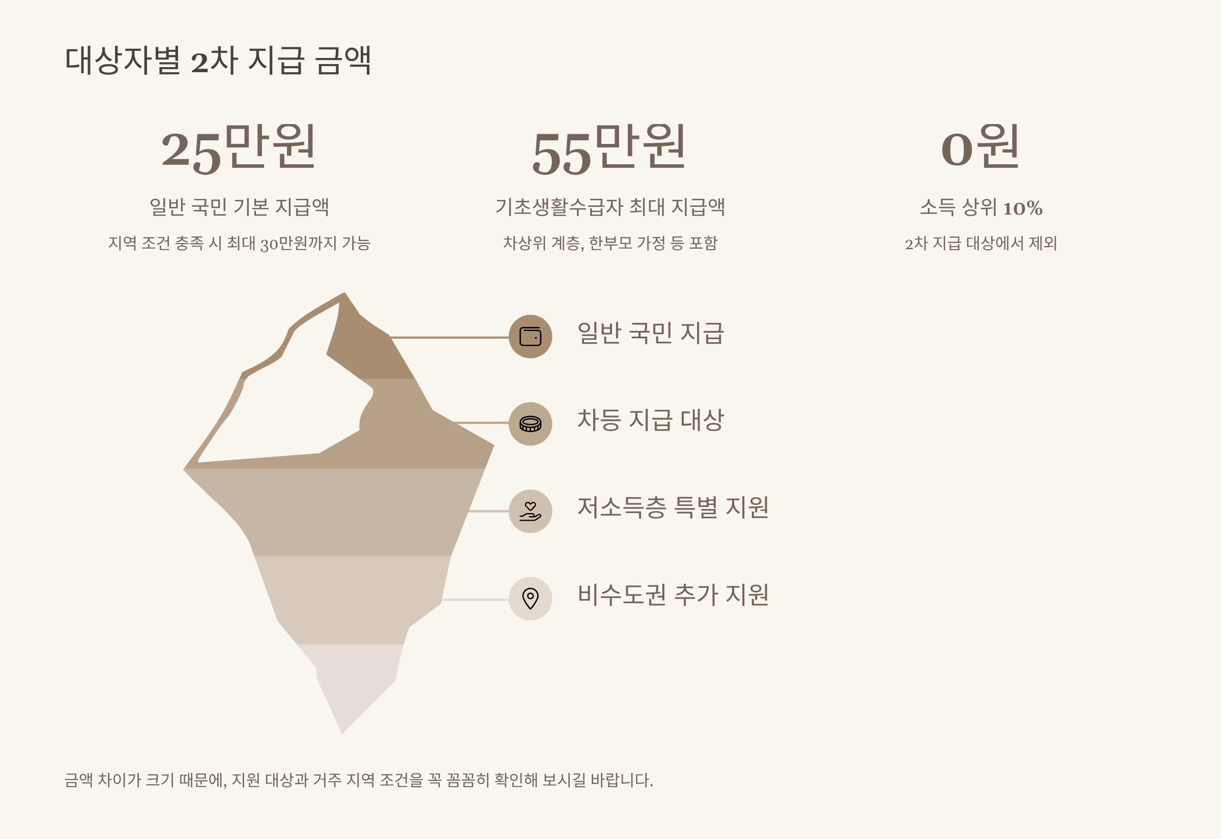 소득 상위 10%는 2차 지급 대상에서 제외되지만, 1차 때 받았던 기본 지원금은 그대로 유지돼요. 반면 차상위 계층, 한부모 가정, 기초생활수급자 등은 보다 높은 금액을 받을 수 있어요. 비수도권 또는 농어촌 인구감소지역에 거주하는 경우엔 금액이 더 올라가기도 합니다.
