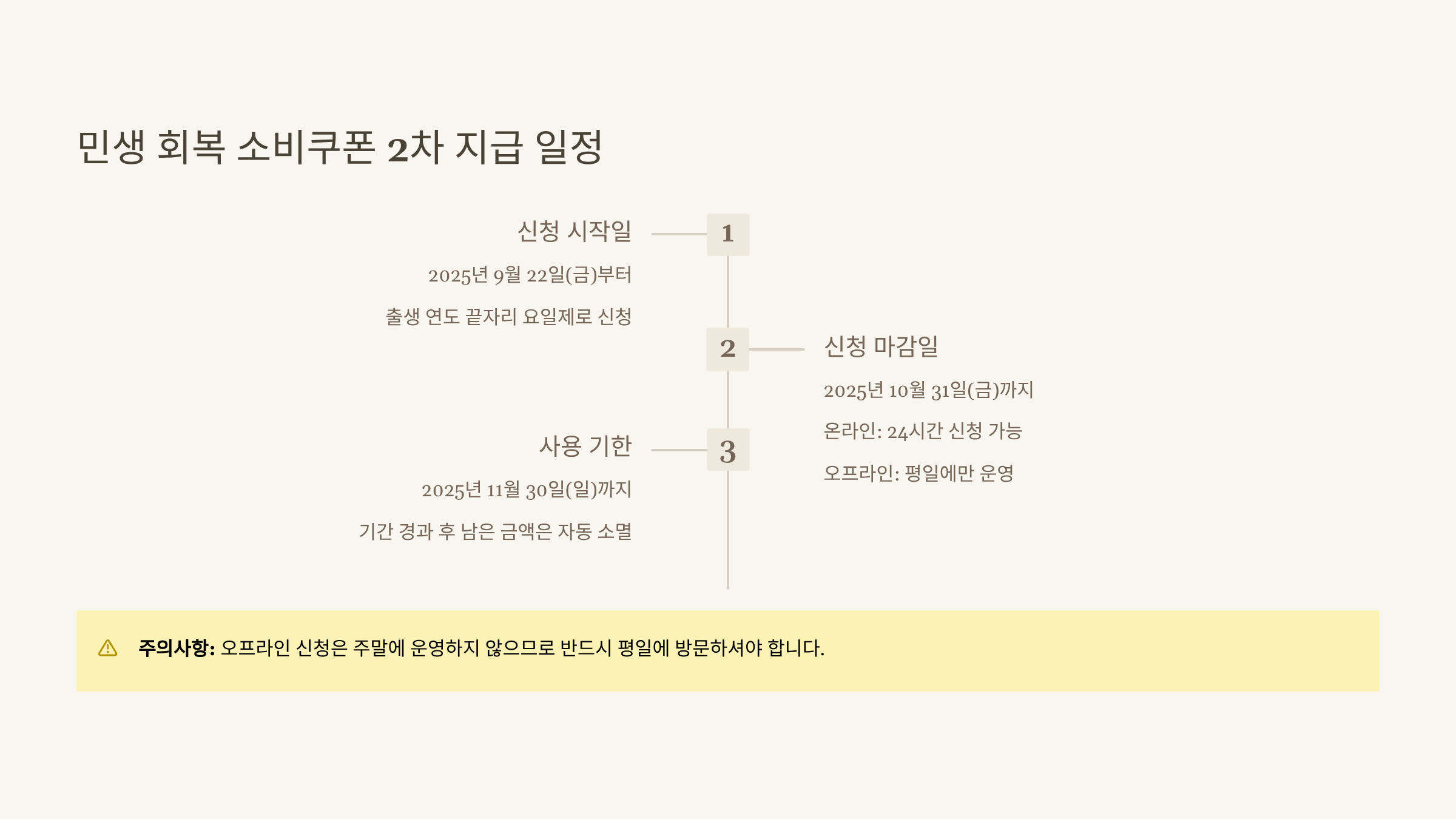 이번 소비쿠폰은 총 2회에 걸쳐 지급되는데요, 1차 지급은 이미 완료되었고 2차 지급은 2025년 9월 22일(금)부터 시작됩니다. 신청 마감일은 10월 31일(금)까지이며, 출생 연도 끝자리 요일제로 신청이 진행될 예정이에요. 온라인 신청은 언제든지 가능하지만, 오프라인은 주말에는 운영하지 않으니 꼭 평일에 방문해야 한다는 점 잊지 마세요.