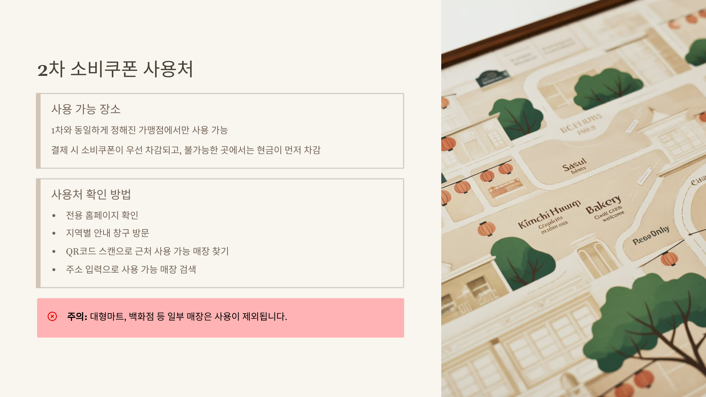 2차로 지급되는 소비쿠폰은 1차 때와 마찬가지로 정해진 가맹점에서만 사용이 가능합니다. 이와 관련된 시스템은 동일하게 운영되기 때문에, 가능한 매장에서 결제하면 소비쿠폰이 우선 차감되고, 불가능한 곳에서는 현금이 먼저 빠져나가요. 꼭 미리 사용처를 확인하고 이용하는 것이 좋습니다.