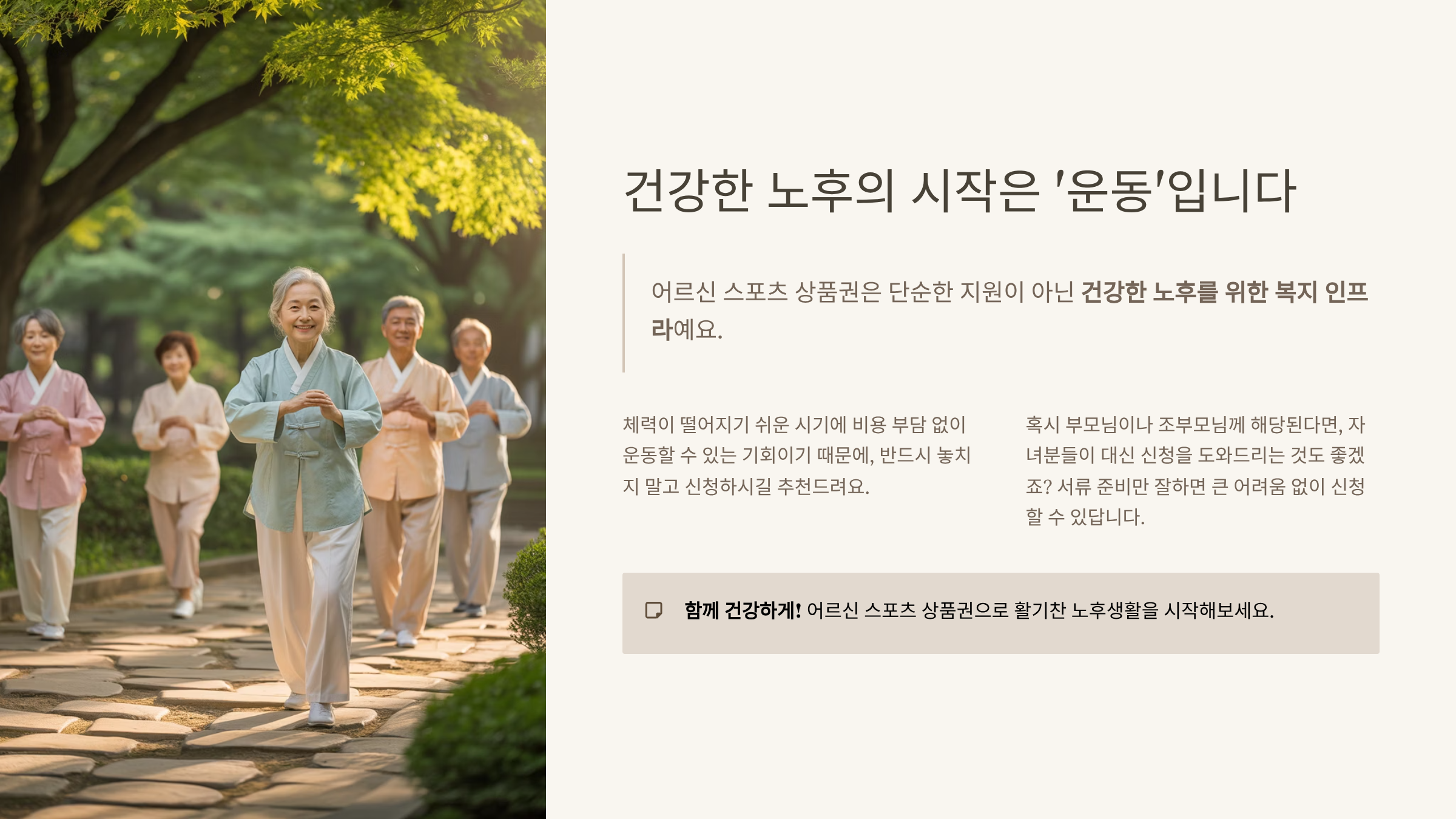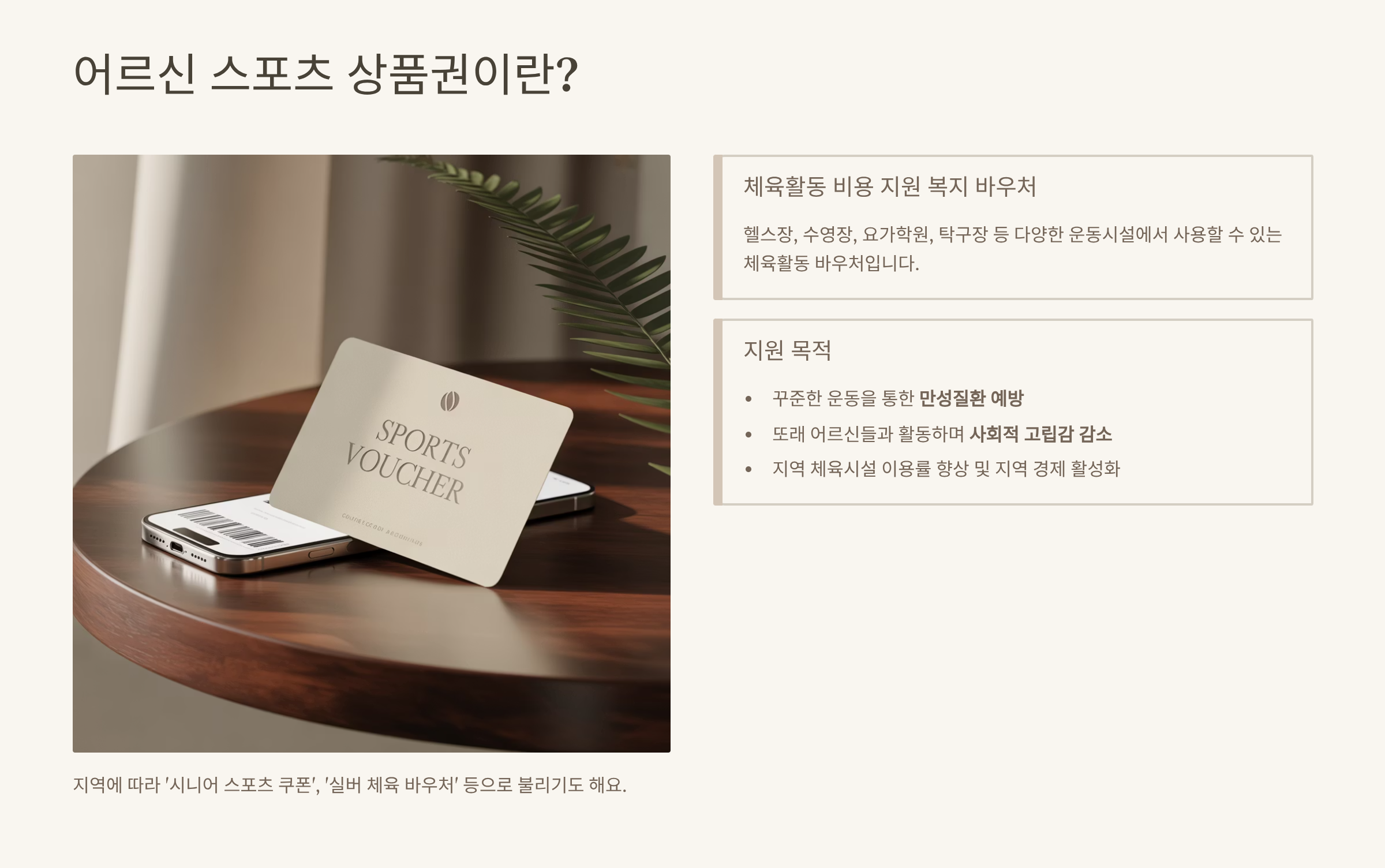 최근 건강한 노후를 위한 복지사업이 다양하게 시행되고 있는데요, 특히 눈에 띄는 제도가 바로 어르신 스포츠 상품권 지원사업이에요.