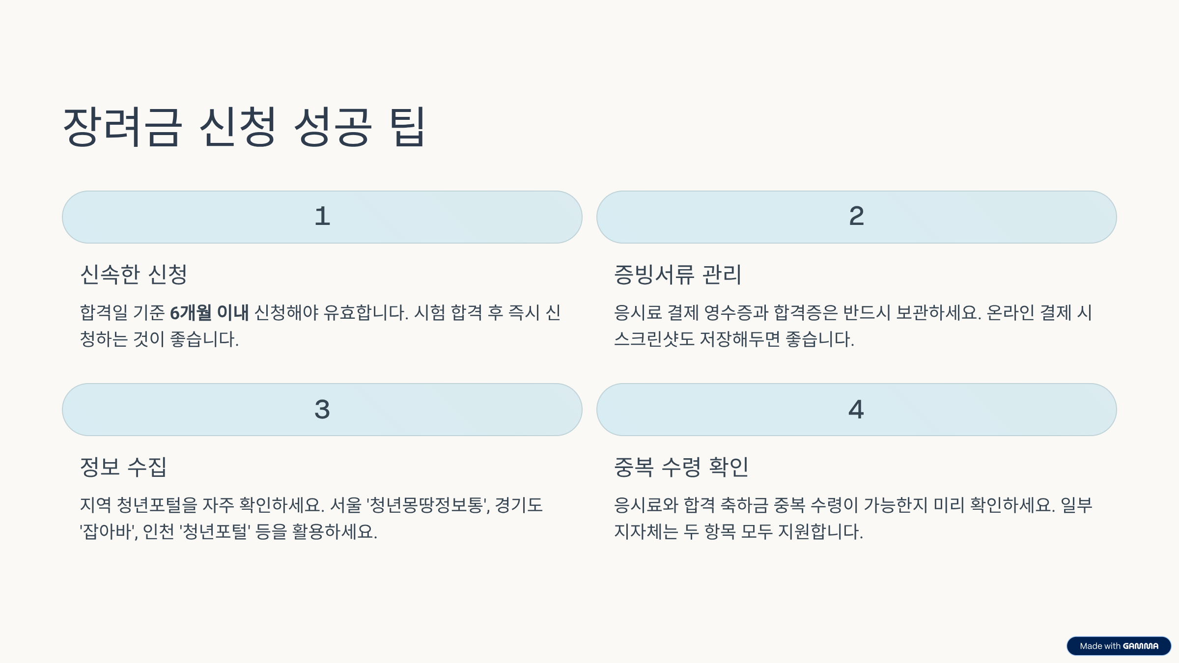 → 서울은 ‘청년몽땅정보통’, 경기도는 ‘잡아바’, 인천은 ‘청년포털’ 등 - 응시료와 합격 축하금 중복 수령 여부 확인