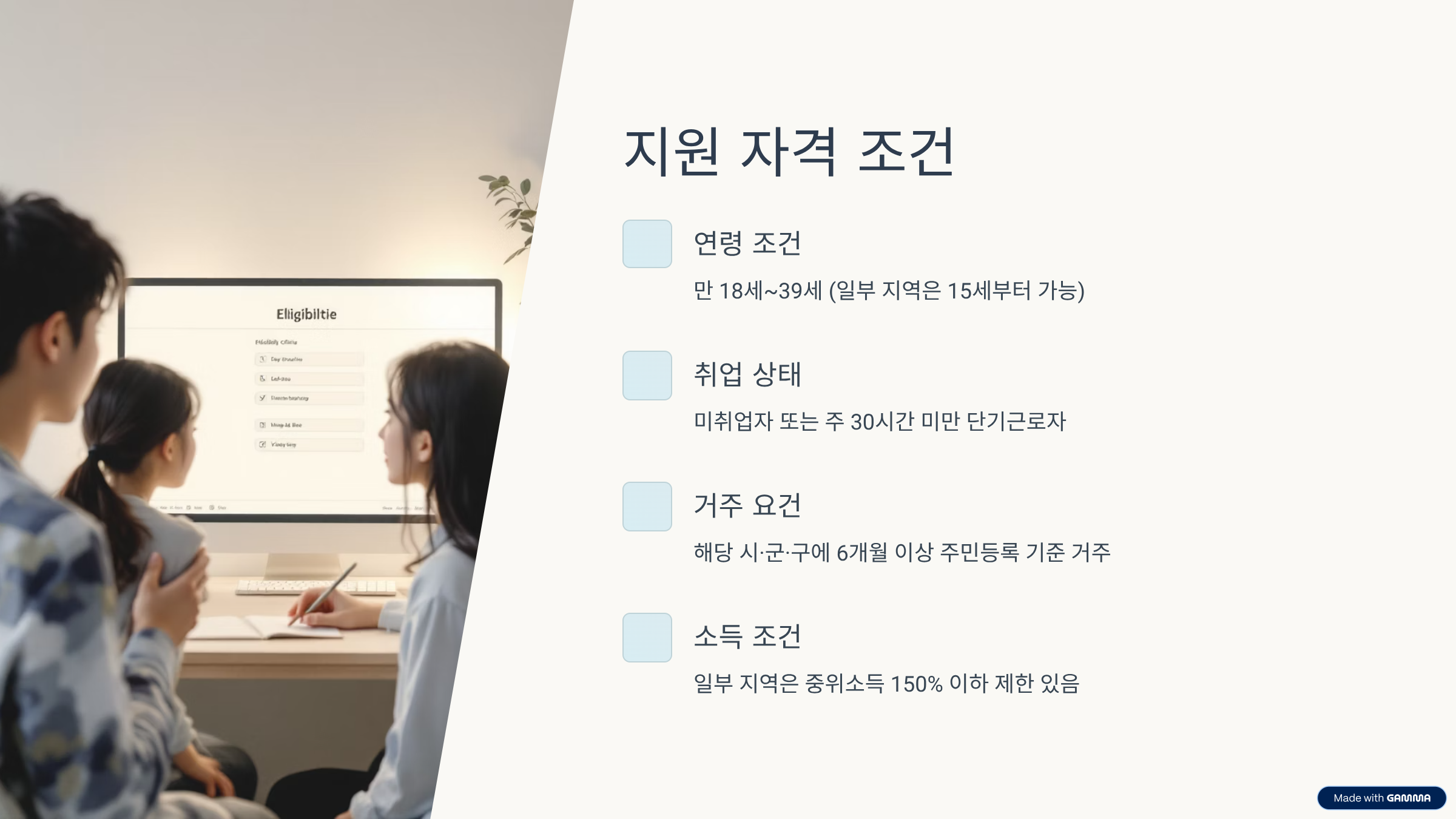 - 나이: 만 18세~39세 (일부 지역은 15세부터 가능)