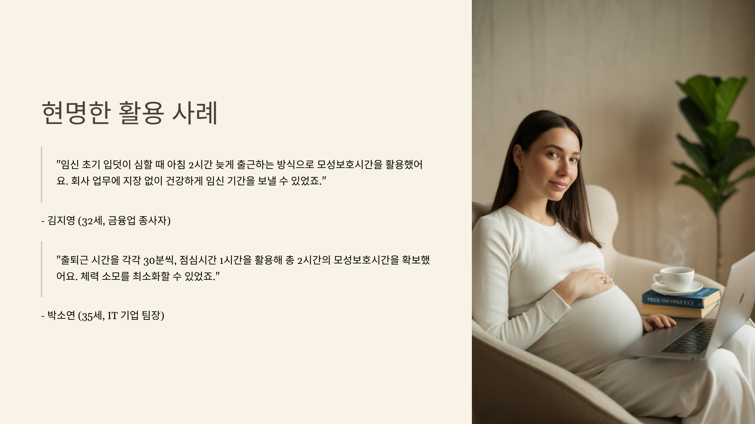 모성보호시간은 선택이 아닌 권리입니다. 임신 기간 동안 내 몸과 아기를 지키기 위해 꼭 활용해야 하는 제도죠. 혹시 아직 신청하지 않았다면, 지금이라도 회사에 요청해 보세요. 충분한 휴식은 건강한 출산과 직결됩니다.