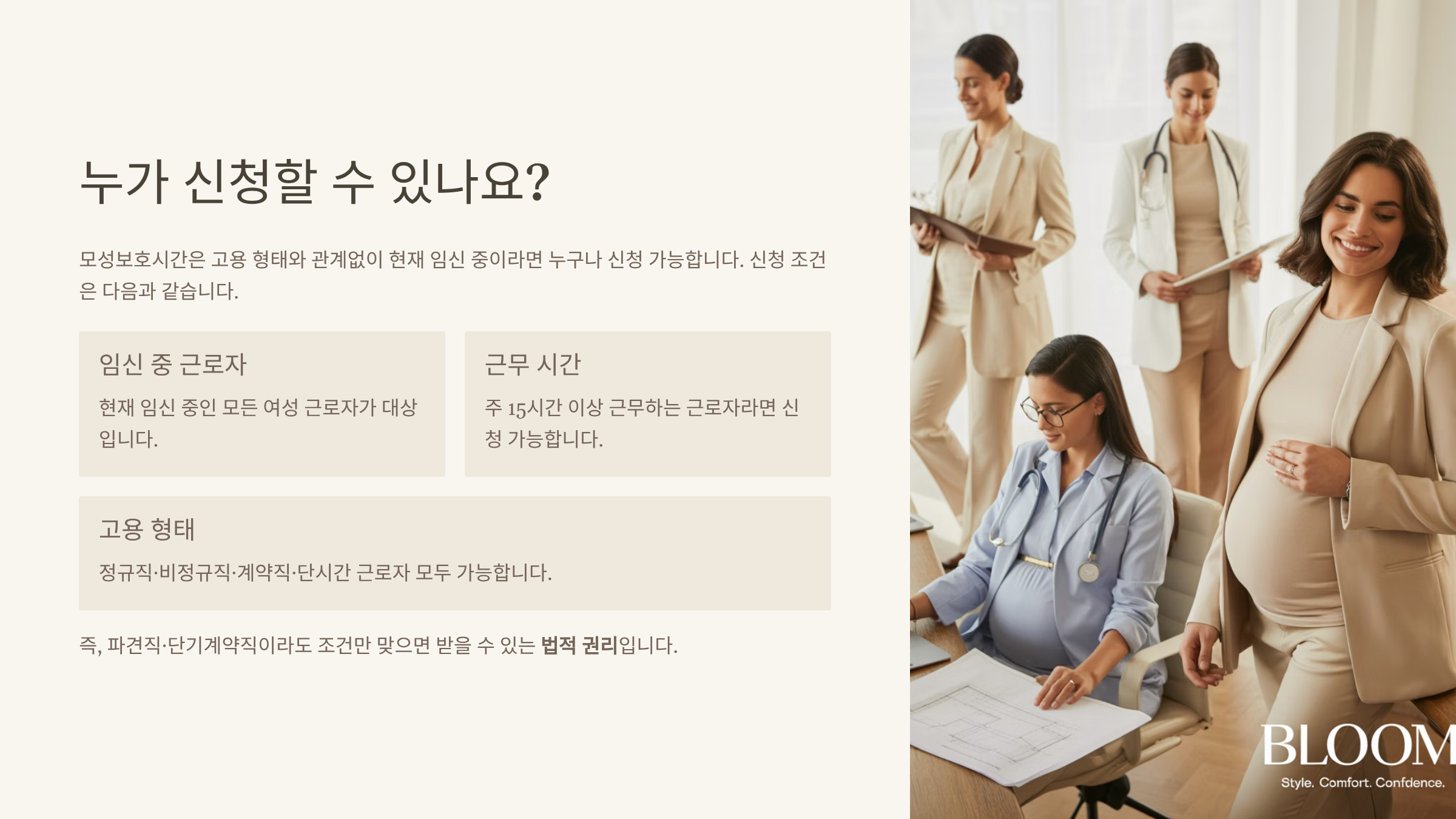 모성보호시간은 고용 형태와 관계없이 현재 임신 중이라면 누구나 신청 가능합니다.