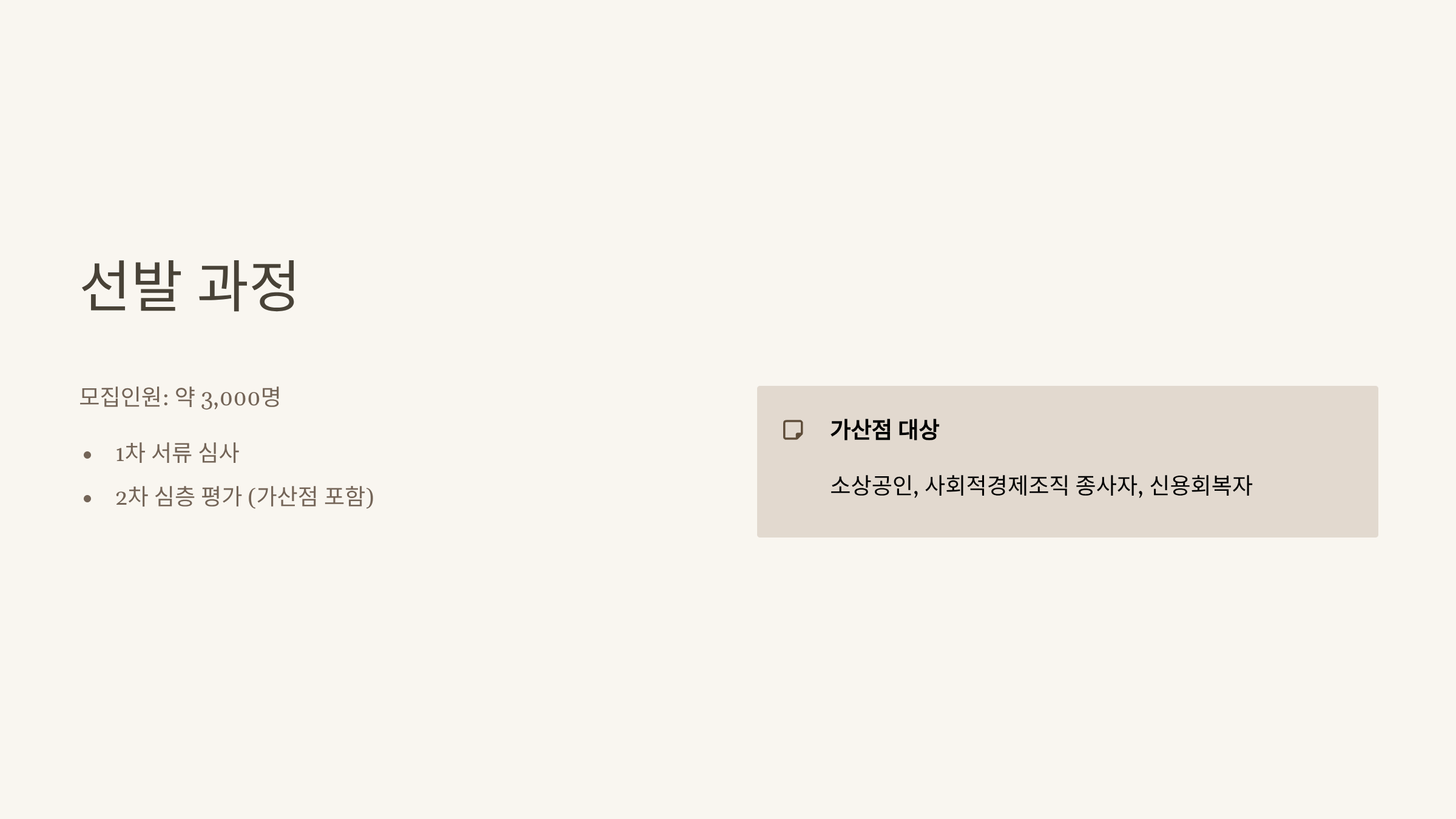 모집 인원은 약 3,000명 내외이며, 1차 서류 심사 후 필요 시 가산점을 포함한 2차 심층 평가가 진행됩니다. 소상공인, 사회적경제조직 종사자, 신용회복자 등은 가산점을 받을 수 있습니다.