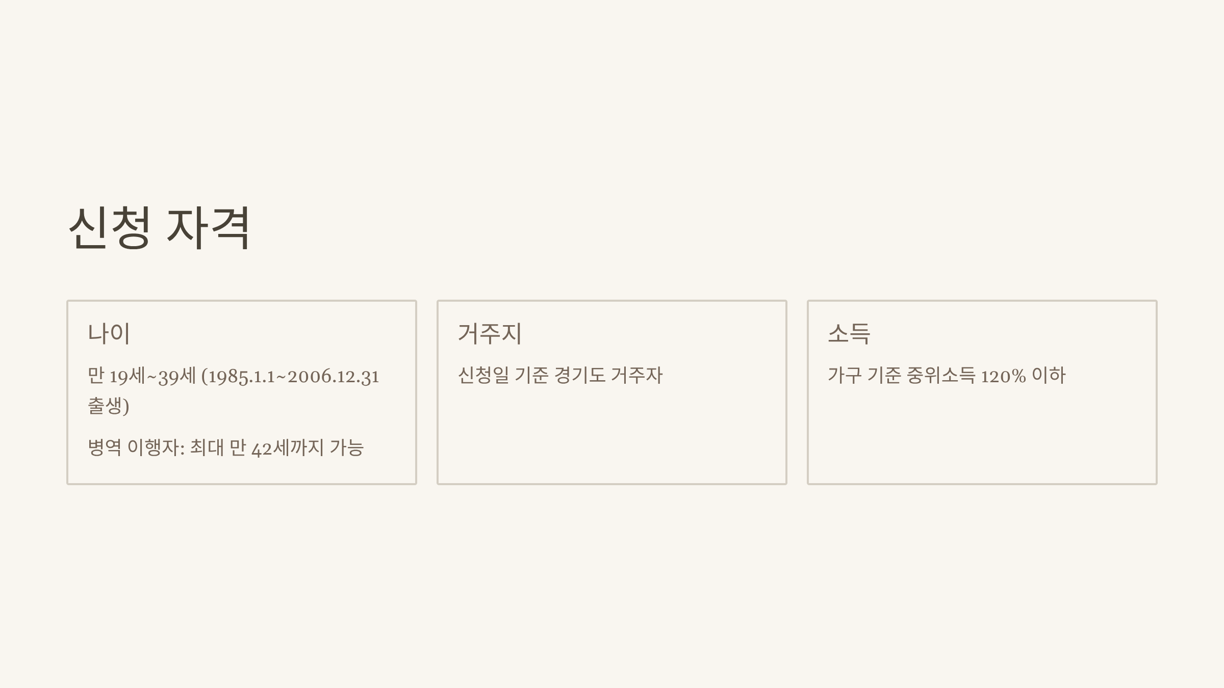 신청일 기준(2025년 7월 25일) 주민등록상 경기도 거주자여야 하며, 1985년 1월 1일부터 2006년 12월 31일 사이 출생한 만 19세~39세 청년이 대상입니다. 병역 이행자는 복무 기간만큼 연령 상한이 최대 만 42세까지 연장됩니다.