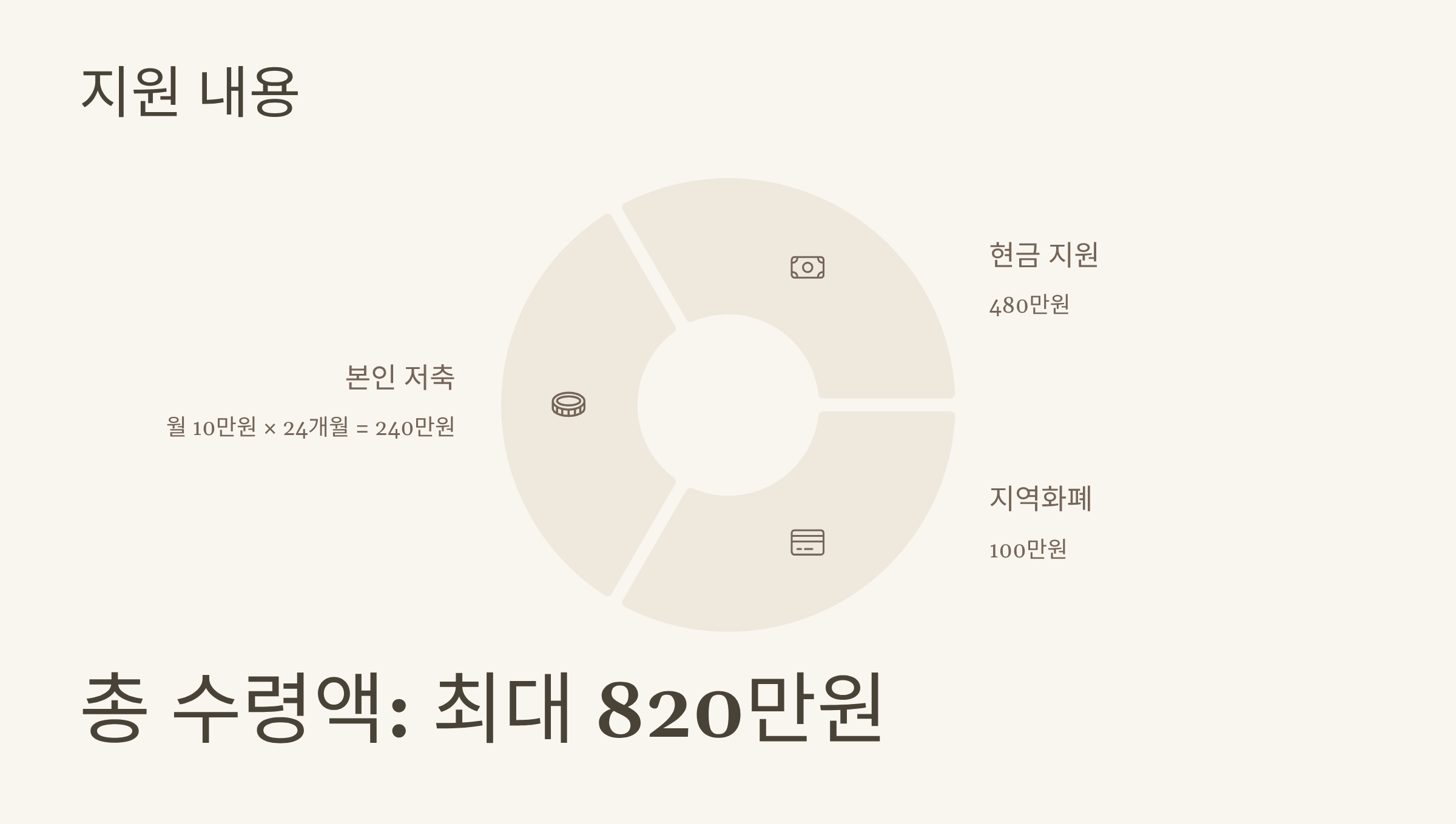 - 본인 저축: 월 10만 원 × 24개월 = 240만 원