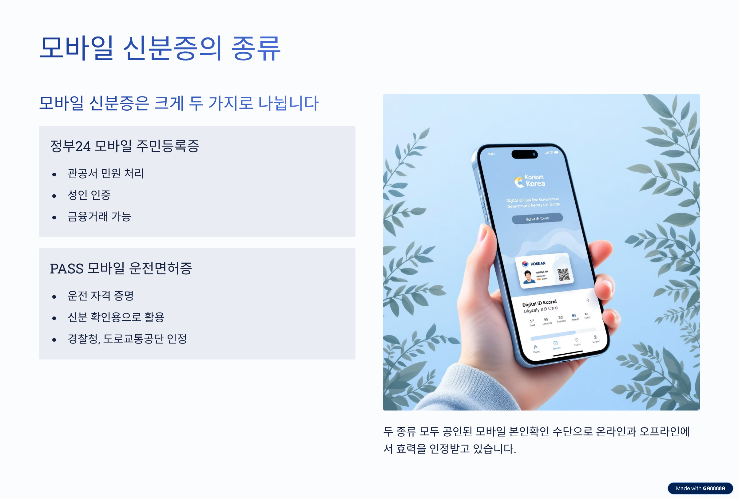두 종류 모두 공인된 모바일 본인확인 수단으로 활용 가능하며, 온라인·오프라인에서 모두 효력을 인정받고 있어요.