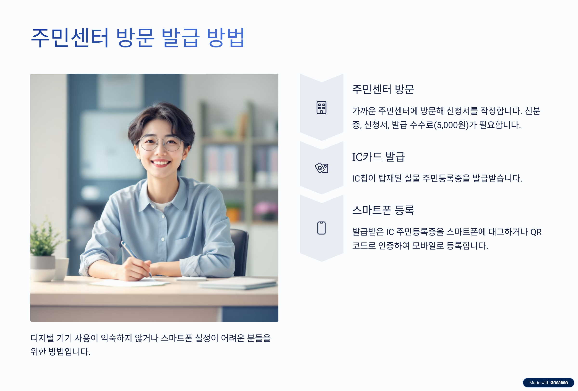 - 가까운 주민센터에 방문해 IC칩이 탑재된 실물 주민등록증을 발급받아요.