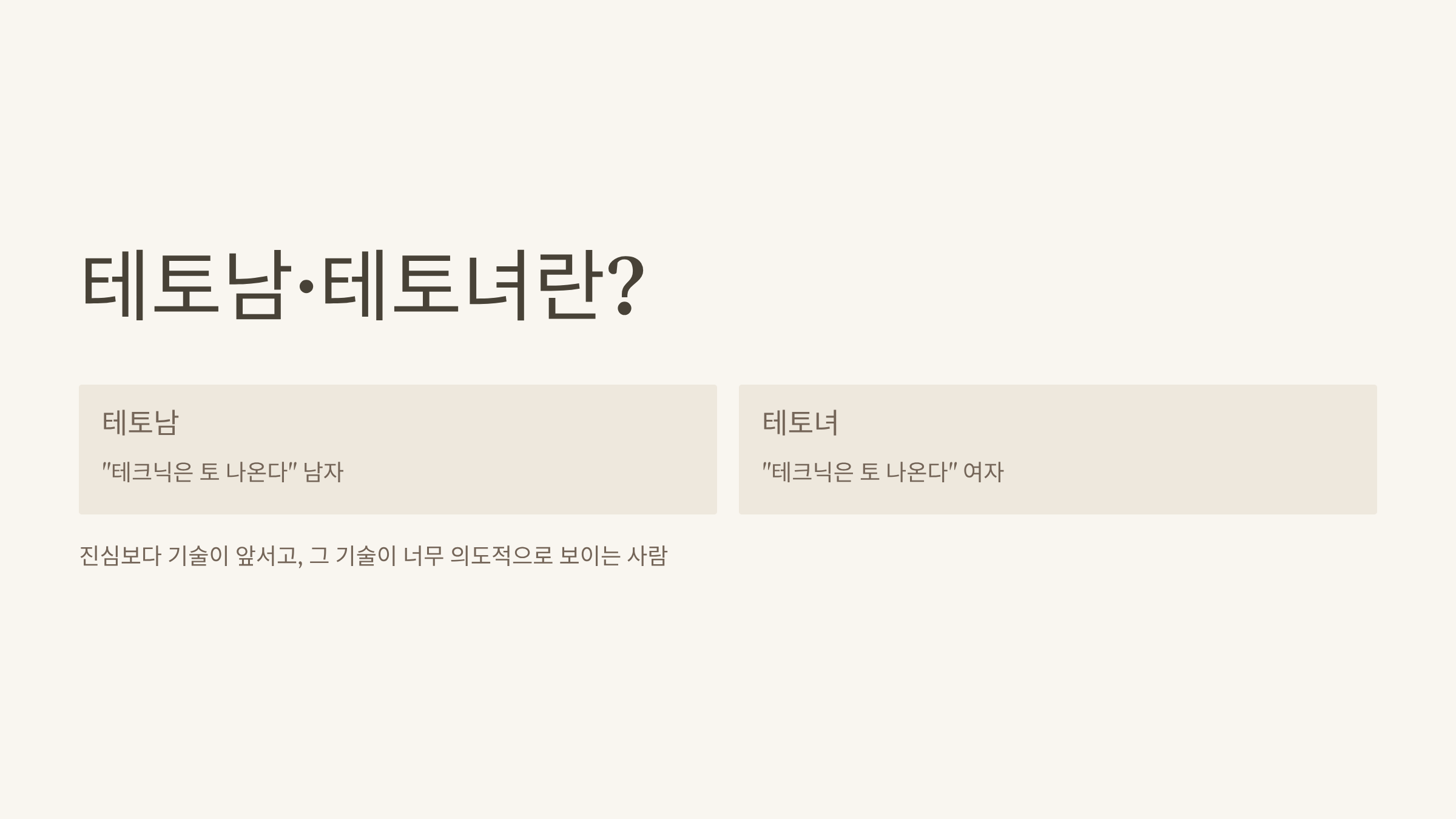 그런데 일부 사람들은 배운 내용을 상황에 그대로 적용하려다 보니, 표정과 말투가 부자연스러워지고, 대화가 ‘연출된 듯’ 느껴지게 됩니다. 보는 사람 입장에서는 진심보다는 계산이 먼저 보이기 때문에 거부감이 생기고, 이를 비꼬는 말로 ‘테토남’, ‘테토녀’가 자리 잡았습니다.